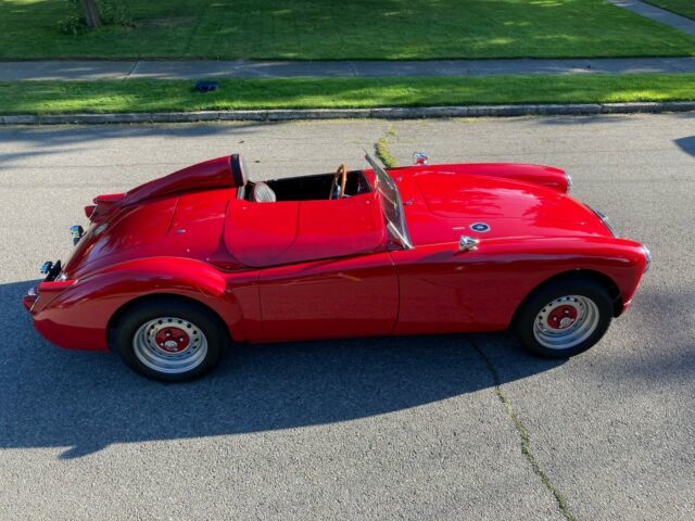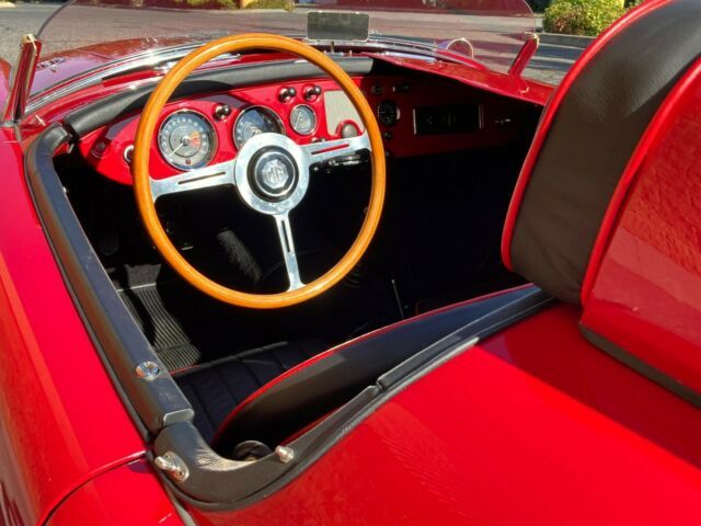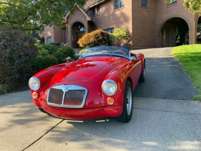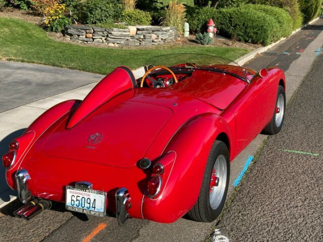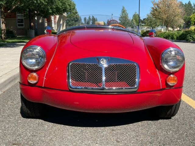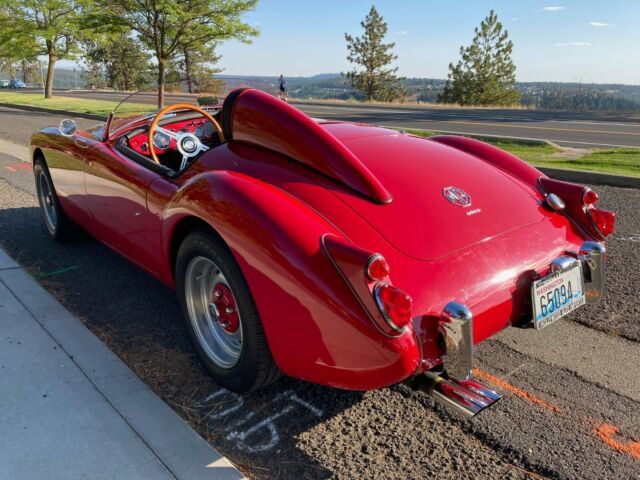 DETAILED DESCRIPTIONS ABSOLUTELY GORGEOUS! This car may be the most beautiful custom MGA anywhere. Just this week I drove it to Manito Park in Spokane. As soon as the car stopped, a dozen gawkers formed around it. It is an eye-catching uniquely deep red color. It sparkles in the sun and its workmanship says, “This car was painstakingly perfected.†RESTORED, THEN CUSTOMIZED TO A DAZZLING MGA SPECIAL.A rust-free car was sought and purchased. An extensive body-on restoration sparing no expense was completed, mostly original. Only the finest parts and materials were used. After restoring to original, then custom parts were fabricated and installed, transforming the car into this MGA Special. These modifications and the quality of the work performed on the car set it apart. NEW MGB MOTOR WITH MILD CAM & OIL COOLER. This MGA is powered by a brand new, rebuilt 1.8-liter MGB five (5) main bearing engine with a mild racing cam and oil cooler. The original MGA motor had only three (3) main bearings, so the new motor is much better. Every mechanical engine part was rebuilt or replaced, including the dual SU H-4 carburetors, starter, water pump, oil pump, distributor, gold 40,000-volt sport coil, and new fuel lines. The fuel pump is the highest quality modern aftermarket Hardi pump from Germany. It is shaped so closely to the original SU pump that it bolts directly into its place.The carburetors are served by braided stainless steel hoses. The oil cooler has new rubber oil lines with brass fittings. The MGB engine number is 18V883AE-L8909, an 1800 motor. CUSTOM PAINTWORK. The body was sanded to bare metal, then primed, filled, and sanded over and over, repeated endlessly until a perfectionist determined that every panel was laser straight. The base coat/clear coat paint is named “Lipstick Red,†a custom blend, not an original MG color. This painstakingly created color is slightly darker than common auto paint reds. It has blue in it, resulting in a deep, rich, true red, with no orange hue. The difference is obvious when this car parks next to another red sports car. The color and silky-smooth finish are noticeably superior. We have never seen better paintwork on any MGA, except maybe Todd O’Dell’s white Twin Cam in Canada. Factory gray body piping was carefully installed, molded very tightly, during re-assembly. SPECIAL WHEELS MAKE THE CAR WIDER THAN STOCK.These impressive wheels are wider than stock MGA wheels. They change the entire car and make it look different, better than other MGAs. The whole car appears lower and wider because it is, resulting in a visibly aggressive stance on the ground. Four Triumph TR6 wheels were acquired and converted to custom MGA wheels. They were sanded to bare metal and heavily powder coated in bulletproof metallic Camaro Silver. They are adorned with Lipstick Red center caps, black and silver metal MG logos, deluxe stainless steel valve stems, and Dunlop decals sourced from England. The rims are an inch and a half wider (1-1/2â€) than stock MGA wheels, but have the same round holes as MGA wheels, so they look correct to the car. The tire size is 185 65 R15. The tires have about 160 miles on them. BETTER STANCE. MGA owners always notice that this car has a better stance on the ground than their MGA but can’t figure out why. The car presents itself on the pavement like a mini-Cobra. Other MGA’s look puny next to this one, with their skinny wheels and tires. The secret is the SPECIAL WHEELS, which are much wider than stock. The holes are identical to stock steel MGA wheels, and the silver color also looks like stock MGA wheels, so no one notices that the wheels are different. The special wheels and tires create a THREE-INCHWIDER TRACK which no one perceives until it’s pointed out. The tires sit slightly outboard from the body, but just barely. The fantastic look of this car cannot be over-emphasized. We have never seen an MGA that equals it. The improved stance looks so tremendous that we expect new a fad of MGA owners copying our wheels. The competition windscreen makes it lower than stock as well. This MGA is WIDER and LOWER than the other MGAs advertised for sale. SEBRING VALANCE. The original metal front valance, front bumper, over riders, bumper brackets and front extension assembly were removed to accommodate a Sebring fiberglass front valance. This valance has no holes or slots and is trimmed with custom fit black piping. It creates a race car vibe and shows off lots of beautiful red paint.The horn was relocated under the car with a specially fabricated bracket. CHROME MESH GRILLE INSERT. The original vertical-bar grille slats were removed, and a chrome mesh grille insert was installed. The chrome grille surround and MG boss were retained and buffed not re-chromed. The gleaming mesh grille emphasizes the overall racy and custom appearance of the car. It modernizes the vehicle and distinguishes it from standard MGA’s. The revised grille was trimmed with custom fit black piping to match the car’s red and black theme. TWIN BULLET RACING MIRRORS. Two aerodynamic bullet style chrome plated racing mirrors are mounted on the fenders, adding more period correct grand prix style. Ball and cup design allows maximum adjustment. COMPETITION WINDSCREEN MAKES THE CAR LOWER THAN STOCK. This item by itself completely transforms the car into an aerodynamic racer. It lowers the entire car by five inches! This MGA is not only WIDER than a stock MGA but is also LOWER than stock. An original MGA windshield frame is used, with the top bar removed and the two side posts cut short. Photos are available that show the carefully machined tops of the side posts, perfectly rounded off and highly polished. The windscreen is ten inches high yet still protects the driver, so no wind hits your face while driving. Goggles are for style not necessity with this car. The competition windscreen uses the same posts, bolts and holes as the regular windshield, so they are interc
