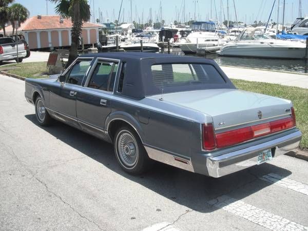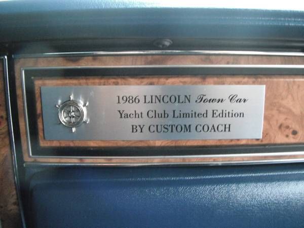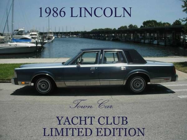 1986 LINCOLN TOWN CAR - Signature Series Top Of The Line Lincoln~ ! "Yacht Club" Limited Edition with RARE navy sailing canvas fully covered top ! Weekend Cruiser / "Land Yacht" CLICK ON LINK BELOW FOR 40 PHOTO FULL SCREEN SLIDE SHOW SHOWING ALL DETAILS OF INTERIOR / EXTERIOR~! CLICK ON FULL SCREEN ICON IN LOWER RIGHT HAND CORNER OF SLIDE SHOW FRAME FOR FULL SCREEN VIEW! http://www. kizoa. com/slideshow-maker/d10651378k2776231o1/lincoln-town-car SERVICE UPDATE: just installed a new 3 yr warranty battery and new starter solenoid! EXTREMELY LOW MILES -44000 MILES!! = 1535 MILES PER YEAR! NOTE: the mileage cannot be verified - the Florida title states 'odometer exempt' due to the fact that the previous elderly owner did not demand the car odometer be inspected by a DMV officer before transferring the title. In Florida the DMV will automatically issue 'odometer exempt' status on older vehicles unless the owner asks for an odometer inspection to verify the mileage. I believe the mileage to be 44000 miles based on the condition of the leather interior. no steering wheel leather wear. pedal wear. & overall condition of the interiorAmazing condition for a car that is reaching CLASSIC / VINTAGE / ANTIQUE STATUS so will only go up in value if properly maintained as it has been for 28 years! The two -tone paint is in good condition for a 28 yr old car - LOOKS GOOD FROM 10-20 FEET AWAY! NOT PERFECT - hood has some fading - more noticeable at certain angles and there is some minor flaking in front of left rear fender well and small whiting area in front of gas doorIF THE PAINT WEE PERFECT I WOULD BE PRING THIS BEAUTY AT $7K! Light metallic blue over medium metallic blue sides with chrome / stainless rocker covers and factory upgrade mag wheels (refinished) SUPER RARE Navy Blue canvas top is in LIKE NEW CONDITION! Navy Blue leather interior is AMAZING condition -! Luxury Pillow Top Seats & folding Armrests like new ! No leather cracks or wear spots. no typical door panel cracks . leather wrap steering wheel like new! Photos don't do justice to the interior -MUST SEE TO BELEIVE! SUPER CLEAN Luxury grade high pile carpet clean with factory mats PLUS BONUS- brand new set of hard to find matching blue factory style mats - front & rear EXREMELY HARD TO FIND large matching center console / cup holder / organizer All the bells & whistles INCLUDING the outside mirror thermometer that STILL WORKS! You can sleep in or eat out of the trunk its that clean! Excellent spare tire with carpet cover Power trunk lid closes itself !Premium Factory sound system / AM/FM / Cassette works Digital dash control panel works with multiple computer controls Keyless entry pad drivers door Power vent windows in front doors - ALL pwr windows work! Antenna does not go up and down - does not effect reception. cheap fix !Passenger power door lock does not work . can be locked manually from inside door lock or with key Have not tried keyless entry -untested - have not been able to locate the code # sBEST FEATURE ! Air Conditioner system was converted from R12 to new R134A and BLOWS ICE COLD ! (cost $1500 alone) THIS JOB WAS DONE RIGHT! (if you know anything about A/C conversion to the new R134A refridgerant - if it is dome cheaply by just changing charging valves etc . it typically will NOT blow near as cold as it should! ) Matching Michelin White wall tires still have tread - about half worn . maybe 20-25K miles left on them Original Owners manuals / owners card Original Lincoln Chrome Key Fob Runs & Drives like a DREAM. QUIET and like riding on a CLOUD! Super dependable 5. 0 / 302 V8 engine = tried and true since the 1960's If you want a REAL LINCOLN that will last for years to come. LOOK AT THIS ONE before you buy a newer one! If you've never owned a Lincoln Town Car you owe it to yourself to put owning one on your 'bucket list' as there is nothing else quite like driving a Lincoln~ !