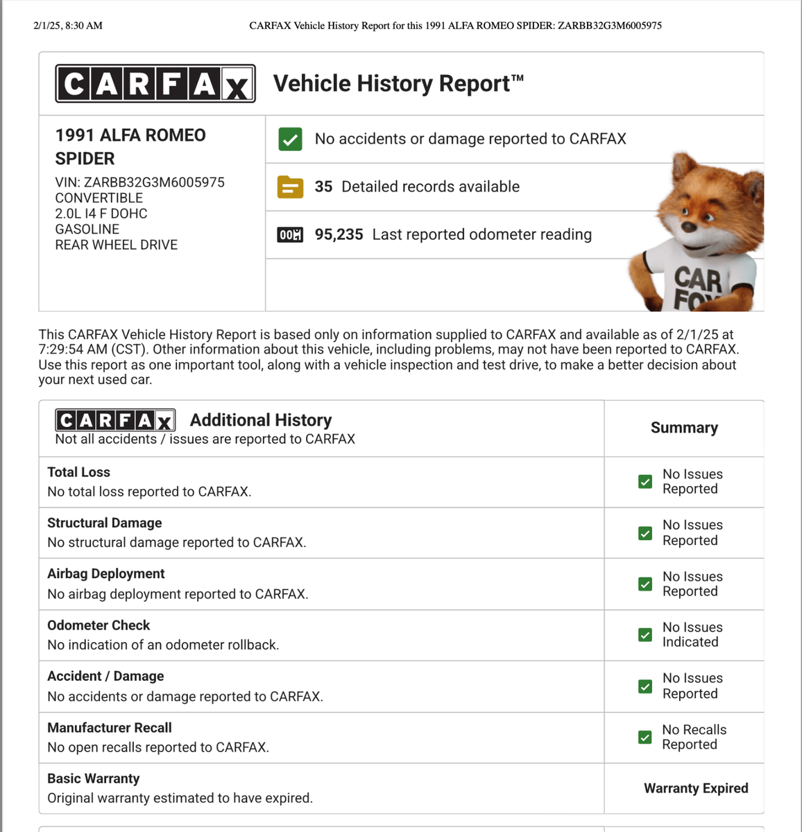 SUPER RARE and CLEAN Alfa Romeo Spider Series 4 (S4) designed by Pininfarina Group that designed FerrarisPOSITIVES: - CLEAN CARFAX. No Accidents nor issues. See Pic. Full CarFAX that I received will be provided to the winning buyer.