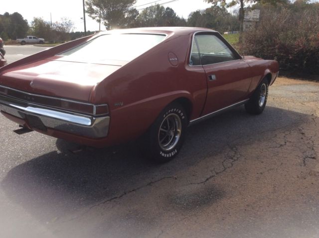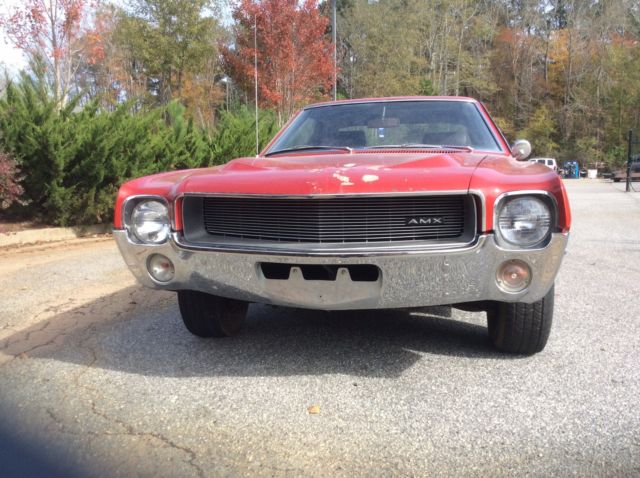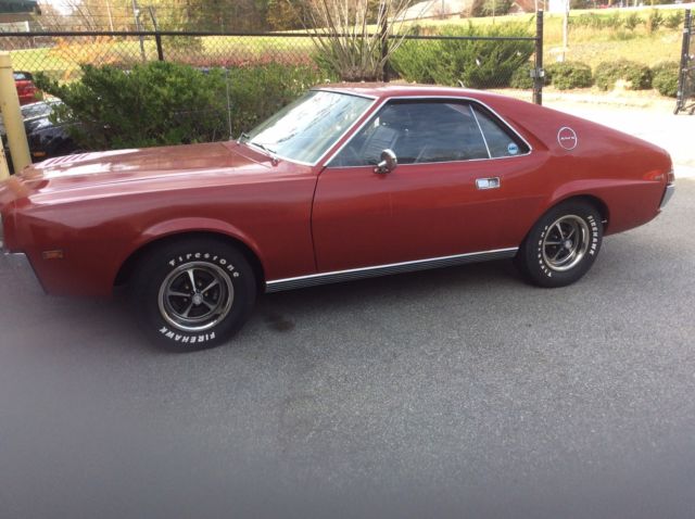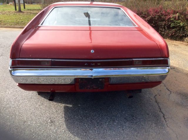 1969. A M X. 343 4 barrel auto. 310000. Miles on odometer. All new brake syste, ll line, hose, fittings wheel cylinders springs, rake pads, aster cylinder have been replaced .Power steering pump has been rebuilt . New starter, ew Solenoid. Origional interior and carpet. All trim is in great shape. Bumpers are in great shape . Original spring anti squeak rubbers are still in place. There is rust in the quarters at rear behind wheel, mall amount in door, nd a few more places . One repaint. Car runs and drives very good for its age . I have tried to list all problems for a good description . Please look at pics . This will make a great car o