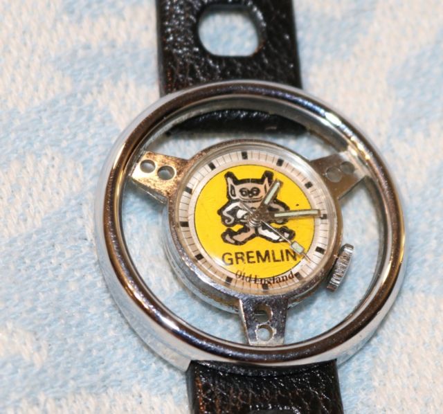 This is a WRIST WATCH, but is an AMC GREMLIN model, most likely from the 1980's, with the little guy on the dial, and a chromed steering wheel surrounding the dial. It is a wind-up watch, and is not working, but I don't know why. The spring is not sprung. It may just need a good cleaning, but either way, it's a pretty awesome little collectible for those of us who love Gremlins! The band is synthetic and is made by Tropic Sport. It is original to the watch. The band measures about 7-1/2 inches. I didn't know a better category to list this in, so please contact me following the auction for a total. Shipping should be around $3.60. No bidders from outside the continentalU.S. please!