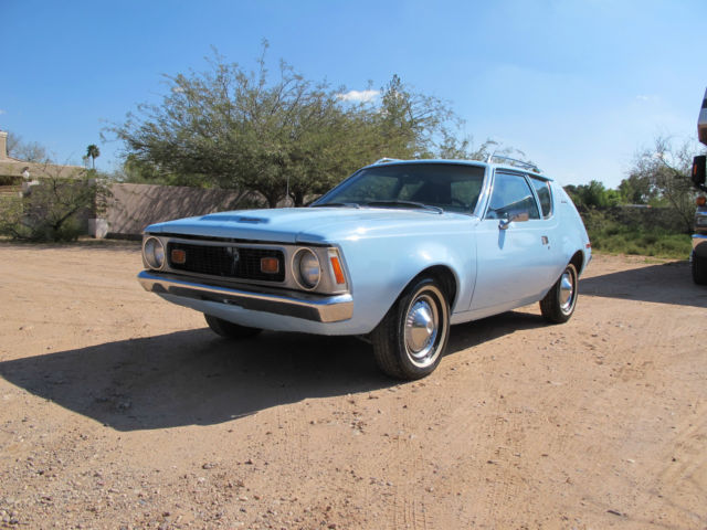 | UP FOR SALE IS A RARE 1972 AMC GREMLINNEWLY UPHOLSTERED INTERIOR ORIGINAL 86XXX MILESRESPRAYED ORIGINAL FACTORY SKYWAY BLUE C3 (SINGLE STAGE PAINT) BUT LOOKS GREATRARE ROOF RACKALL TRIM INTACTAC WORKS BUT BLOWS WARMRUNS AND DRIVESBOX A CLEAN TITLEGREAT CAR JUST NEEDS A LITTLE LOVE!!!BUYER IS RESPONSIBLE FOR PICKUP OF VEHICLEFULL PAYEMENT IS DUE WITHIN 48 HOURS OF END OF AUCTIONDISCLAIMER: VEHICAL IS BEING SOLD IN "AS IS" CONDITION NO GUARENTEESOR WARENTEE IMPLIED. I DO NOT OWN THIS VEHICAL NOR AM I RESPONSIBLE FOR IT INANY WAY. JUST POSTING IT FOR THE SELLER. ANY COMMENTS. QUESTIONS. OR CONCERNS SHOULD BE ADDRESSED TO HIM AT KOHLERCHIP@YAHOO. COM |