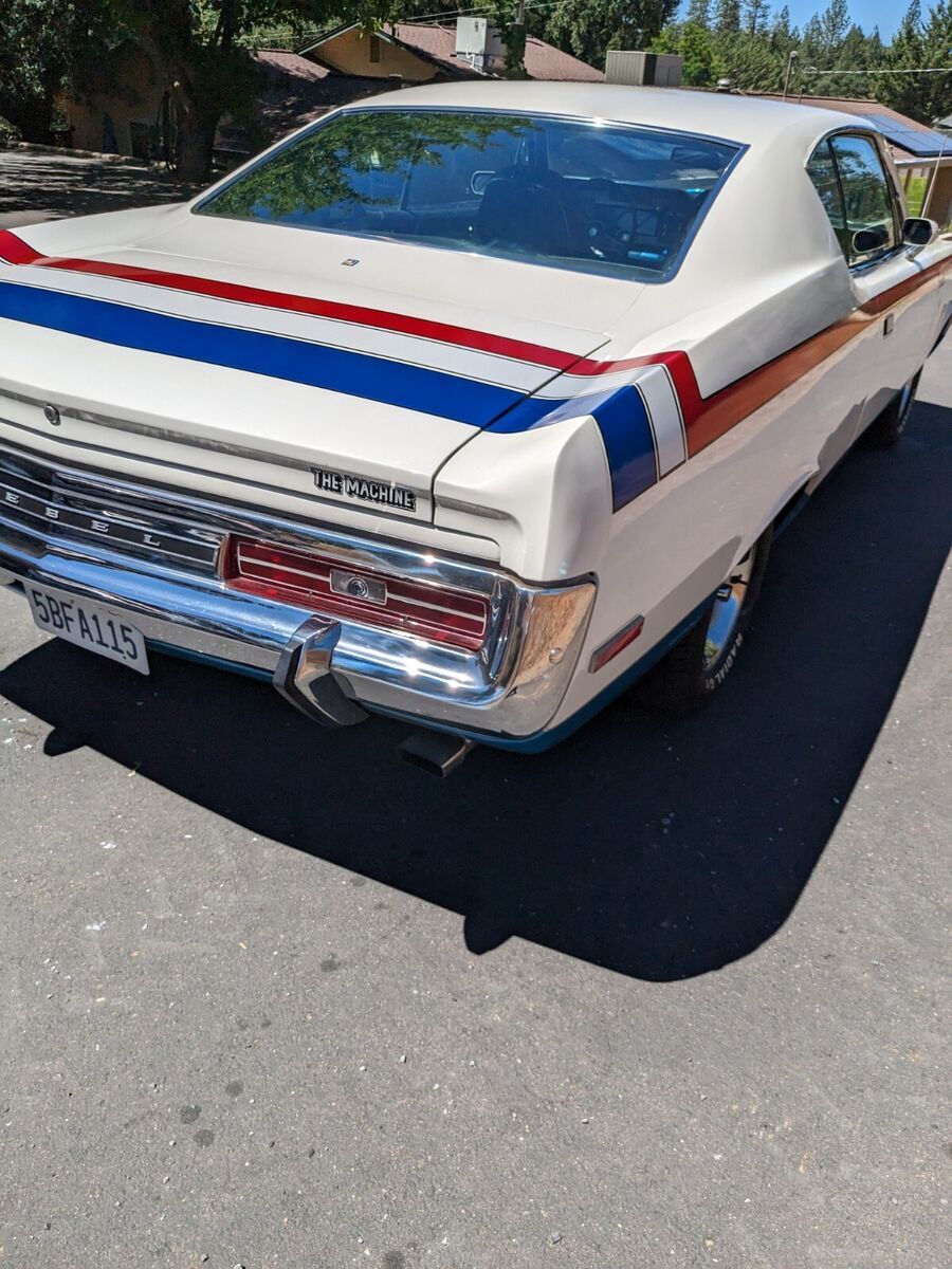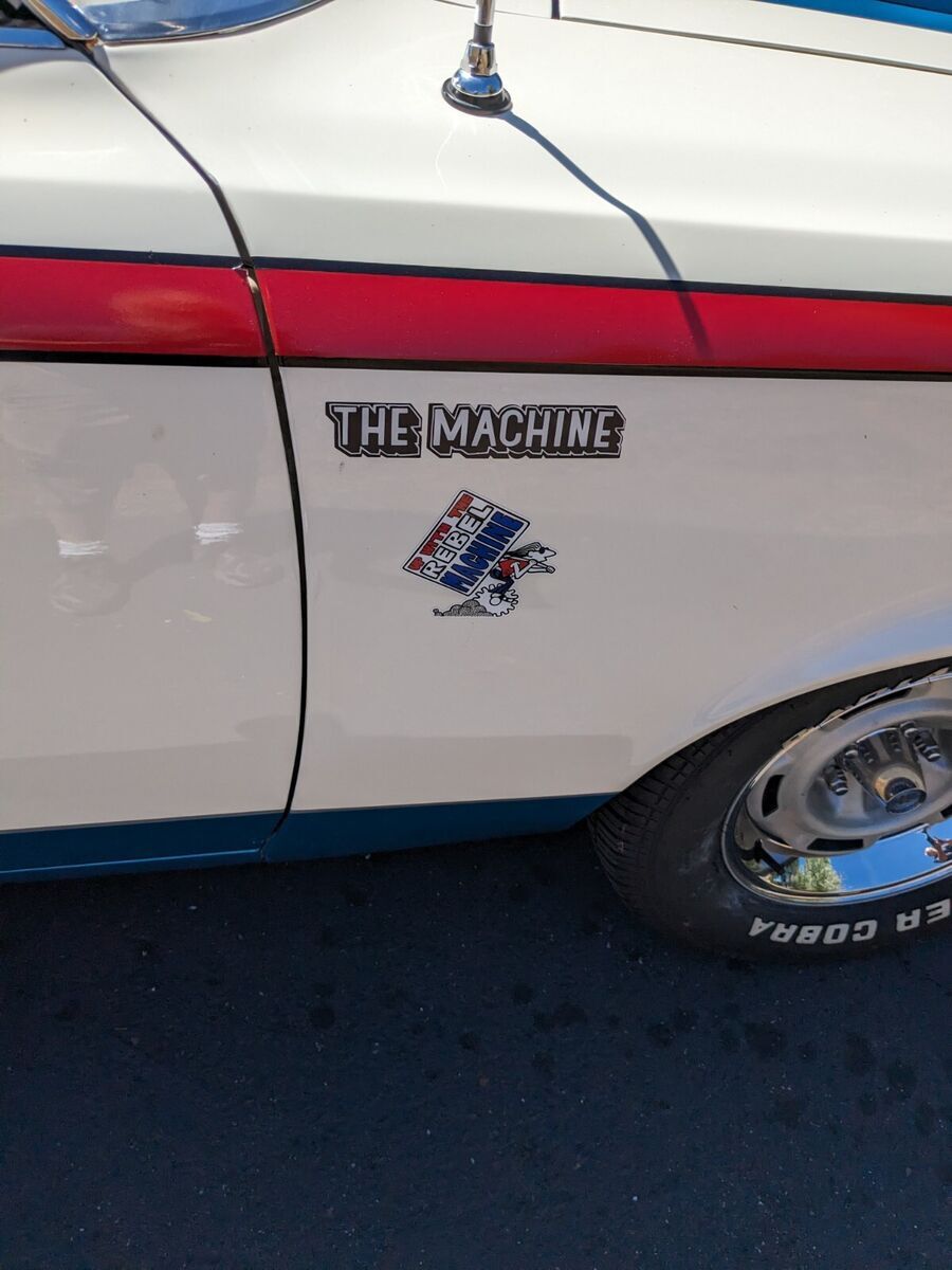 Vehicle Details Original Red White and Blue Rebel Machine. 390 4-speed, posi, power steering, power disk brakes, Air Command. Repainted and rebuilt engine in 2013. New front and rear suspension and rebuilt 354 differential in 2020. Runs and drives excellent. Has 390 Machine intake - exhaust manifolds and carburetor. Approximately 2,000 miles since restoration. Orginal Machine Wheels and Trim Rings. Restored Flow-Master mufflers. AM FM radio and clock. Original floor and trunk pans. Full quarter panels replaced off of rust free 70 Rebel donor car. Car is sold AS IS WHERE IS.