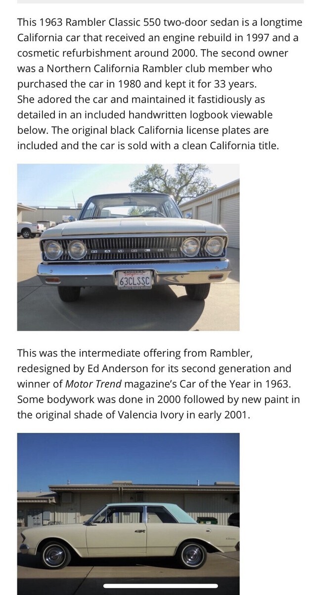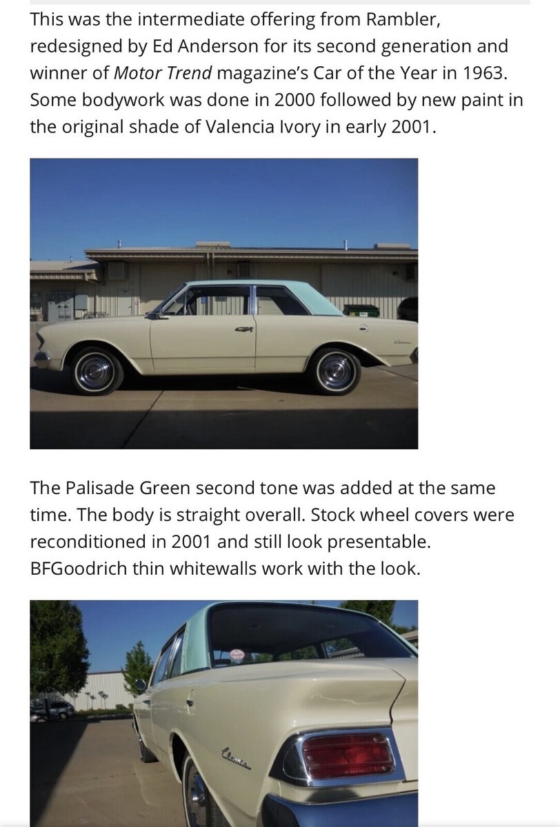 1963 AMC Rambler Classic “550” Vehicle Details 1963 AMC Rambler Classic Details: Garage kept 196 cast iron OHV 3spd manual - 3 on the tree Wilwoods on the Front - Drums on the back Aluminum Radiator Petronix ignition/Coil New plugs/wires Rebuilt 2bbl Carter carb Alternator upgrade from generator New starter LED lighting all around Retro Bluetooth Radio Nice sound system Maintenance log from 63 Original TSM and other documents Interior is a 9/10 Exterior 8.5/10 The car runs smooth and drives well. Shifts well. Some small paint chips…nothing that takes away from the car. |