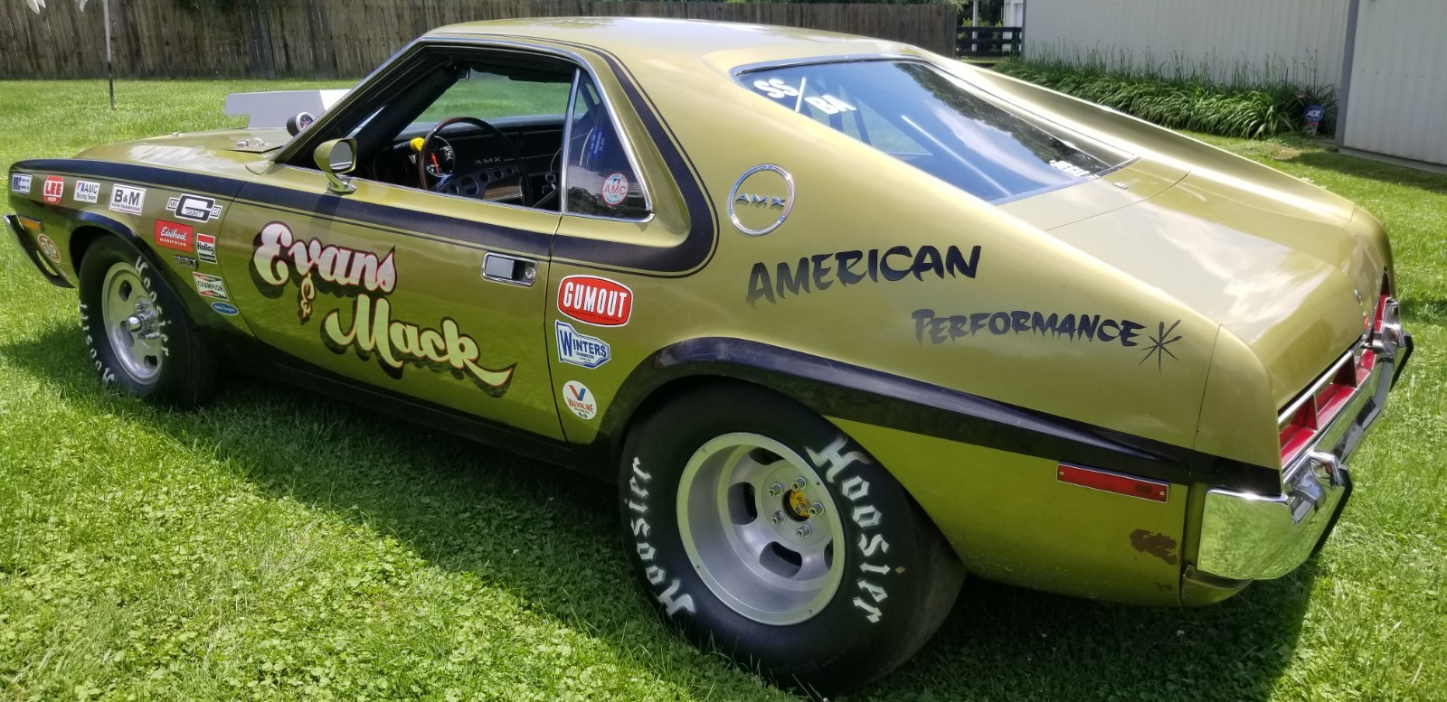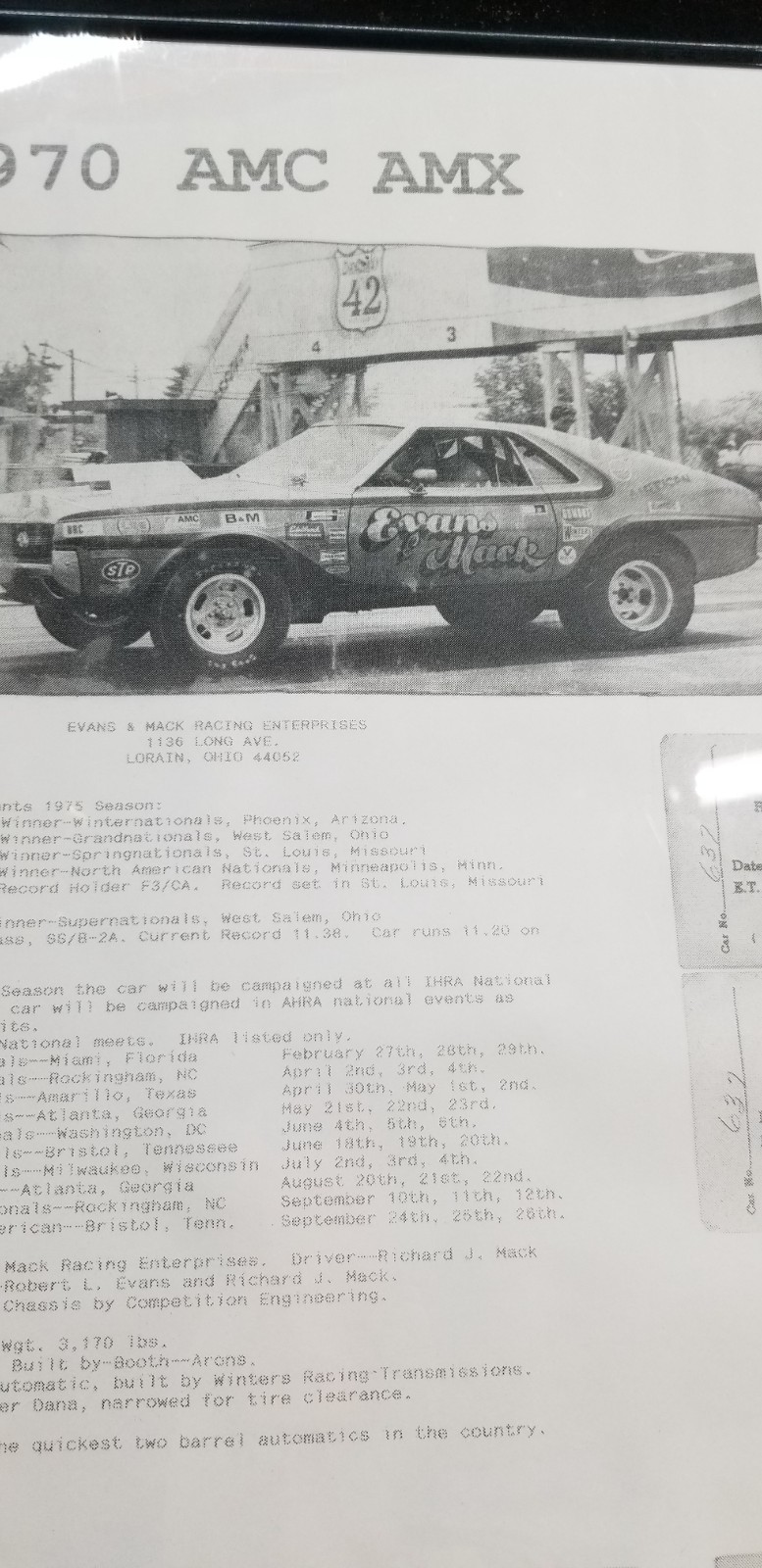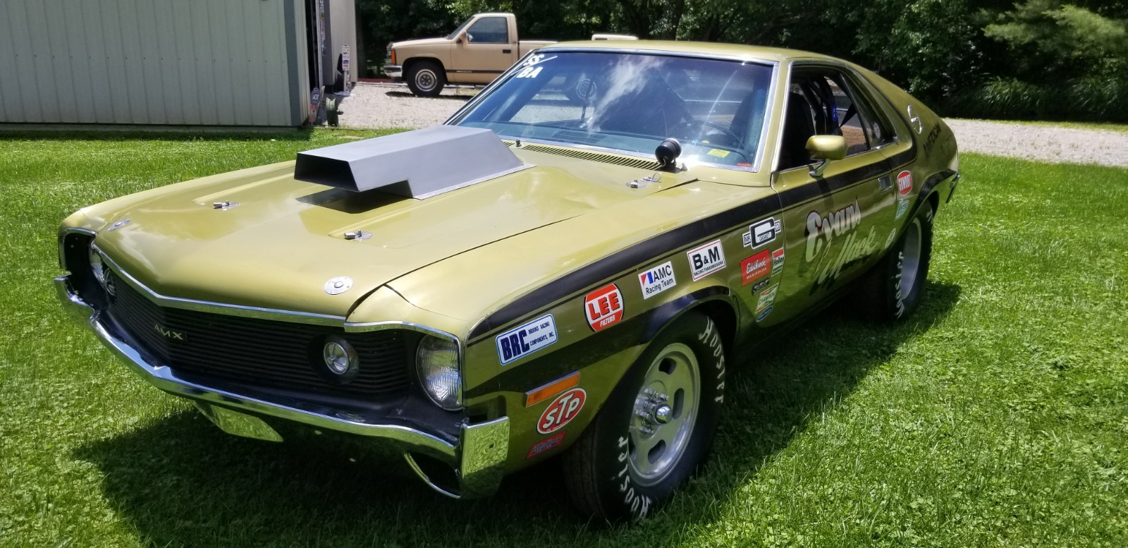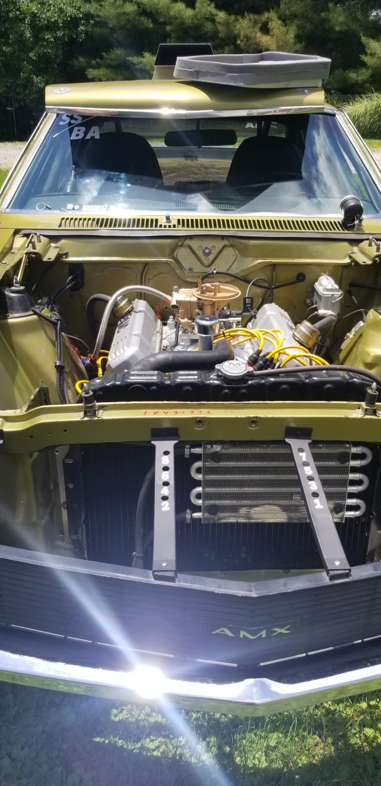 No longer taking amx to Kenosha show storm chances to high.This1970 amx was converted to a drag car in the early 70s. Motor was built by Booth & Arons ( still has this motor in the car) motor made over 500 hp with the 2 barrel carburetor sitting sideways. The AMX was campaigned through out the 70s in the SS3BA class where it was the fastest 2 barrel drag car in the US in the mid 70s. Motor and transmission have been freshened up with 0 passes. Brakes have been upgraded to disc front and rear Dana 60 rear end with 5.57 gears. No longer have original 2 barrel carburetor. Recreated original set up with the 2 barrel. Have the 1050 Dominator set up to run on car also AMC trades considered