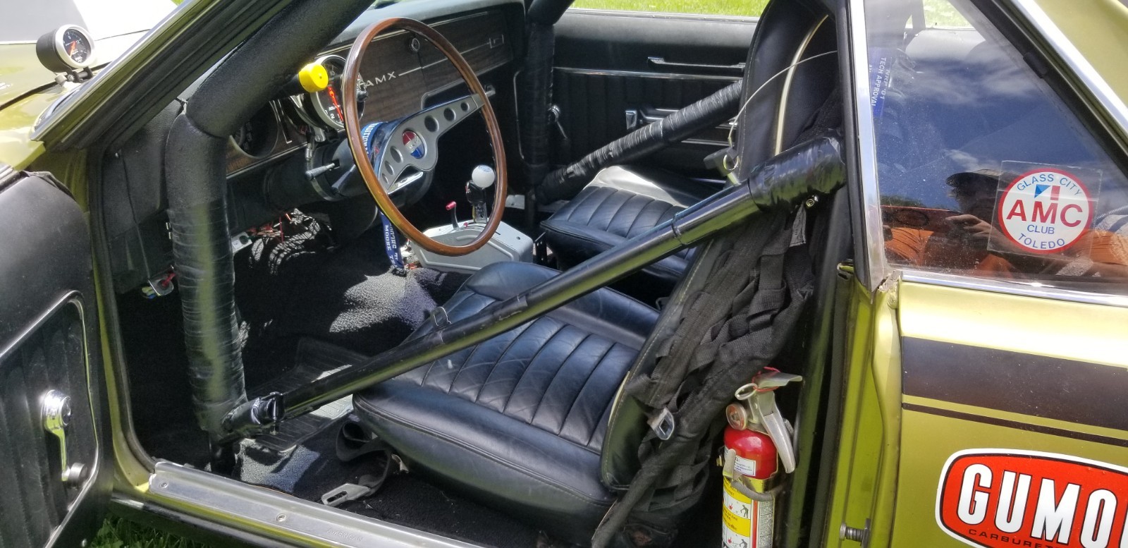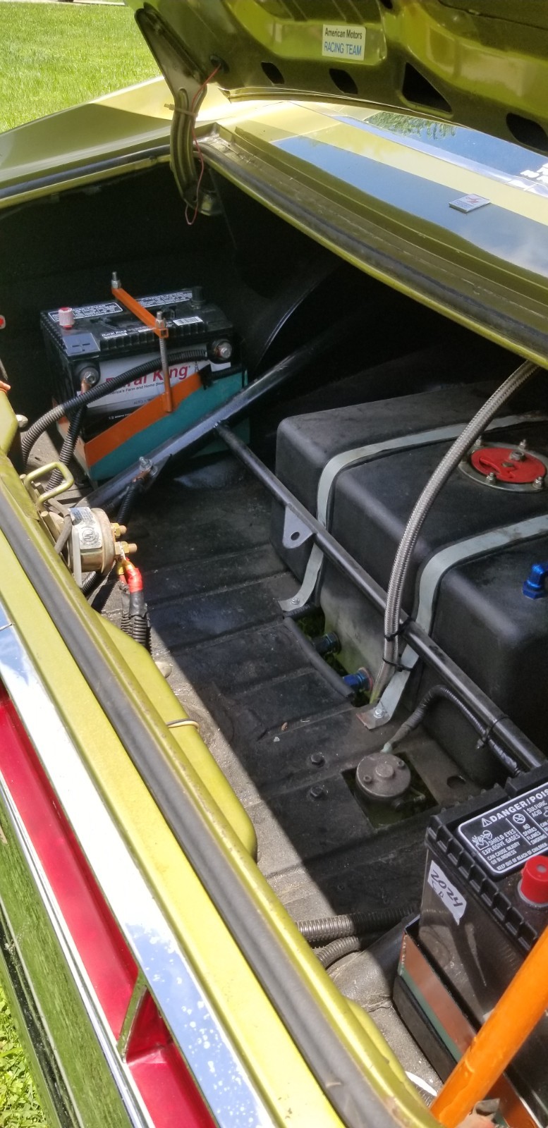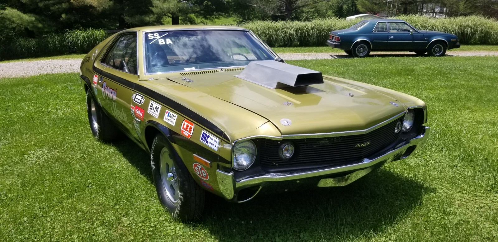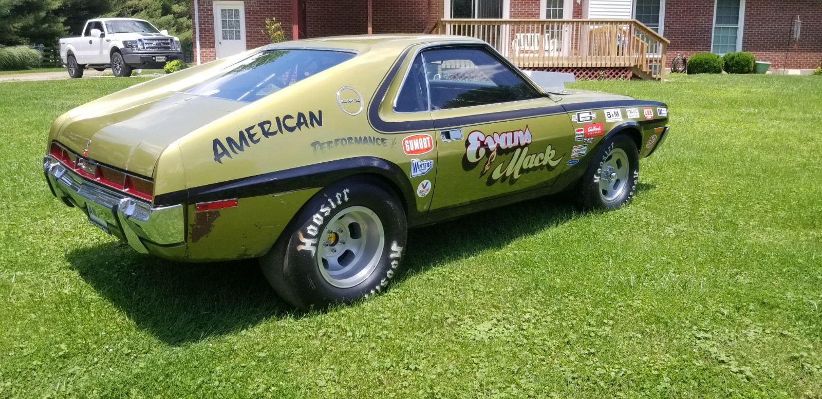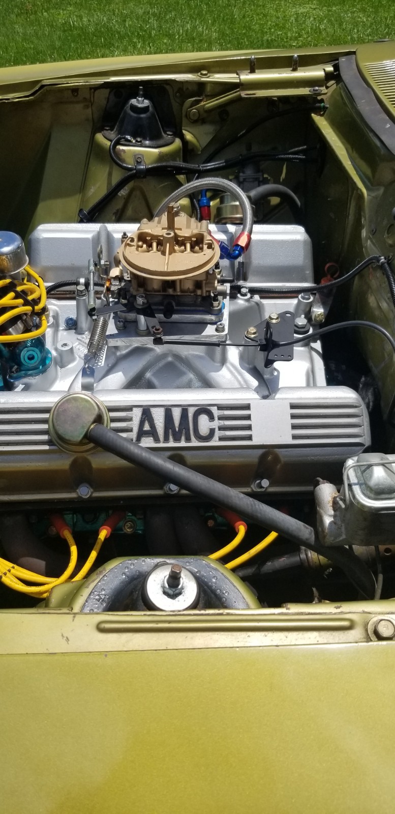 No longer taking amx to Kenosha show storm chances to high.This1970 amx was converted to a drag car in the early 70s. Motor was built by Booth & Arons ( still has this motor in the car) motor made over 500 hp with the 2 barrel carburetor sitting sideways. The AMX was campaigned through out the 70s in the SS3BA class where it was the fastest 2 barrel drag car in the US in the mid 70s. Motor and transmission have been freshened up with 0 passes. Brakes have been upgraded to disc front and rear Dana 60 rear end with 5.57 gears. No longer have original 2 barrel carburetor. Recreated original set up with the 2 barrel. Have the 1050 Dominator set up to run on car also AMC trades considered