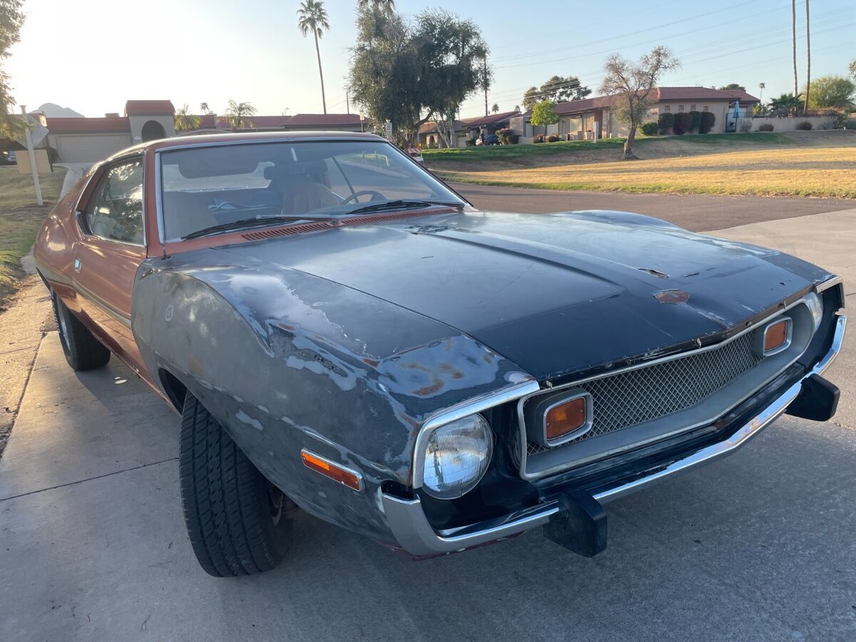 NO RESERVE! 304 V8, 3 speed manual. Hard to find a manual transmission Javelin in any condition anywhere in the country, let alone running and driving, the manual trans ones are just not out there. Complete car, not a project. Can be driven. Has a luggage rack, original carpet, headliner, back seat are all still pretty nice. I have the chrome trim for it. It was removed for paint but then never painted. Has a ding on the left rear quarter panel and on the hood.Paint on the hood is peeling off.The tires are good, does not have working AC/heat. Has an exhaust leak noise, sounds to me like a header gasket. Really fun car to drive around town and run errands in. I take it on 80 mile drives going 65mph and have a blast in it. I've had people drive/fly in from Dallas, San Francisco, El Centro, Prescott, Show Low and Los Angeles in the last few months to buy old cars from me. I am a hobbiest/enthusiast and a big car guy with no life so I have recently completely gone through the car to make it as nice as I could for its next owner. Recent repairs to make it nice for the next guy: New Champion aluminum radiator Rebuilt cylinder heads (Expensive $$$$) - Pulls hard especially at high speeds on the top end, pretty fast now for a 304 New Trailing arm bushings New distributor Cleaned out fuel tank rebuilt carb with new carb kit (could use a carb spacer still, for better re-starts, after shutting it off when running errands) New fuel filter timing adjusted New rear shocks fixed cigarette lighter New temp sensor New original style Motorola alternator, but I recommend upgrading to a 150amp (Powermaster performance part #8-46141-347)if you do a lot of driving. New thermostat lubricated window tracks New spark plug wiresNew battery Clean AZ paper title in my name in hand, registered to me. Title says not actual miles on it, but I think that is an error. It happens often in Arizona when you go for a repair or emissions testing and the emissions guy messes up and types in 99,000 miles instead of 96,000 miles(or forgets the correct mileage from the 20-60 seconds from when he looked at the mileage to when he enters it in his computer so he just puts whatever he can sort of remember)and then the car is sold and the next person registers it and puts the correct 96,000 miles on the title, but the miles went backwards because the emissions dude had a typo and put 99,000 miles, so then the system/mvd marks the title as having not actual miles. $500 non-refundable deposit due within 24 hours and full payment due via wire transfer within 3 days. $500 deposit is non-refundable. There are a lot of nice javelins that have been recently done by big name people including the Prestone Javelin: https://www.caranddriver.com/news/a18661758/defiant-drive-taking-a-spin-almost-literally-in-prestones-1036-hp-hellcat-powered-72-amc-javelin-amx/ https://www.youtube.com/watch?v=H8lA1hcqSy8 https://www.conceptcarz.com/s7379/amc-javelin.aspx https://www.youtube.com/watch?v=0-7_l9q9F8A https://www.youtube.com/watch?v=H8lA1hcqSy8 https://www.roadandtrack.com/car-culture/style/a16569265/theres-an-outrageous-amount-of-custom-work-on-ringbrothers-amc-javelin/