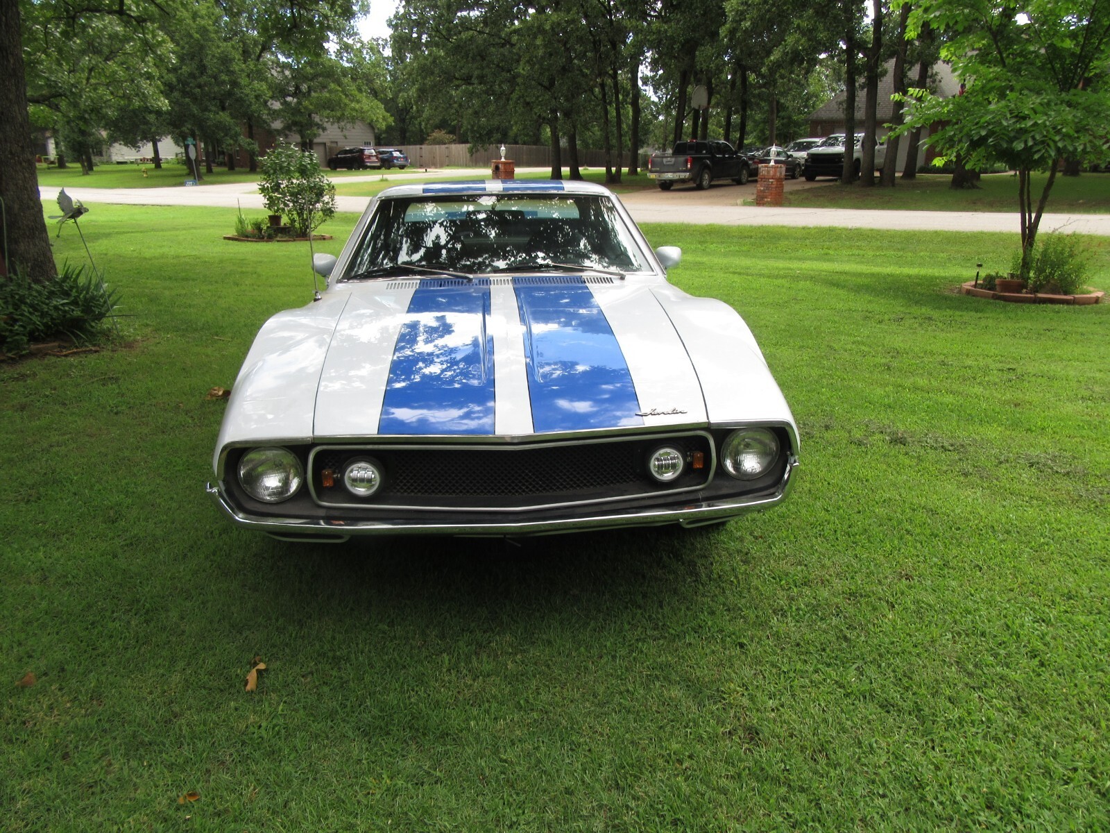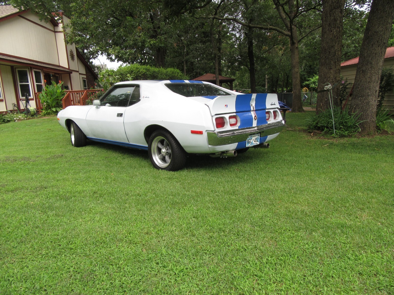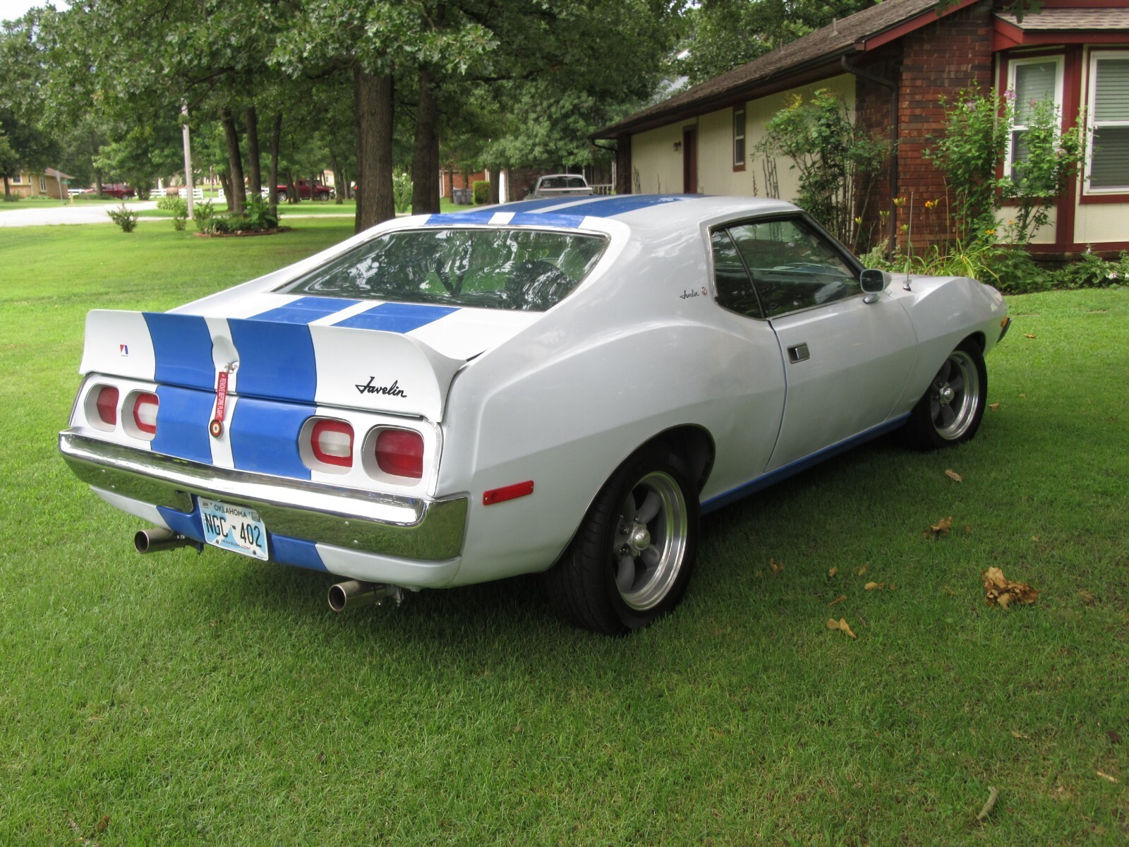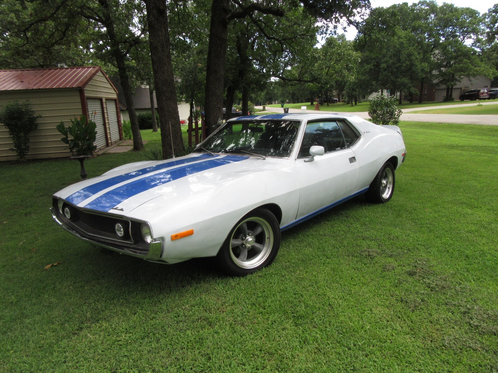 recently completed 74 AMC Javelin project in attractive paint scheme. California car, 1 spot of rust under trunk gasket about 3/4" fixed with metal. new door, hood, and trunk gaskets, AMX spoiler, re chromed bumpers new 16" tires on American Racing 5 spoke wheels.. New leather seats, carpet and good headliner. Rebuilt AMC 360 with AFB style carb, Edlebrock intake, Patriot ceramic headers, New AC compressor, lines, condenser, and drier, and refurbished evaporator. Rebuilt steering box and PS pump, new lines. New suspension, including control arms, strut rods, bushings, and ball joints, and springs. Almost all parts to return to stock included, including luggage rack trunk lid and rack. As I mentioned, this is a newly completed build, and as such, still has some bugs to work out (AC not charged or debugged, steering alignment), and the price reflects this. I am thinning the herd; ask any questions, and I can help load for transport. actual milage is unknown