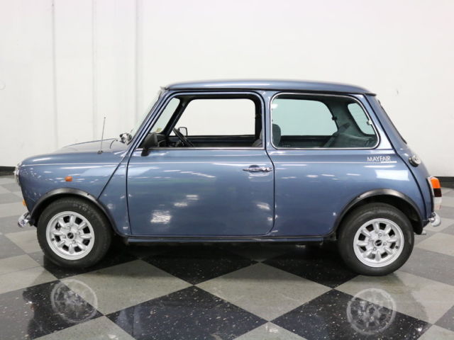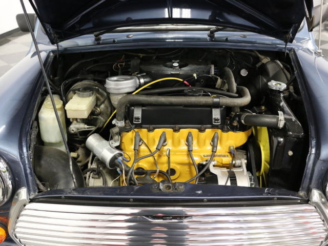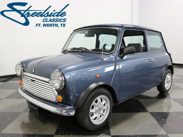 With vintage looks and handling, this late-production 1991 Austin Mini is a great opportunity to own a great example of the car that started it all. Essentially every front-wheel-drive compact car that followed duplicated the Mini's groundbreaking design, although very few, including its modern namesake, have ever managed to duplicate its combination of endearing personality and go-cart-like handling. Mini production continued for decades in England mostly because the cars were consistently popular. As a result, this unusual light blue Mini is instantly recognizable anywhere it goes. And while you may think the current Mini is small, this one is positively tiny, which is the whole point. Similar to other British makes, Minis can rust in the most demonic ways possible, but since this one benefits from decades of development and instant-collectable status, it has never seen inclement weather and has been touched up as needed. The doors fit nicely, the hood gaps are tight, and the trunk seals up nicely, all suggesting a high-quality car that has always been properly cared for. New rubber seals were used throughout, and the slender chrome bumpers fore and aft look great, particularly with the cool protective grilles over the headlights. I think you'll find that when you see this car in person, you'll have a hard time resisting it, which is all part of the charm. Inside, the diminutive external dimensions are stretched to their limits in every dimension, resulting in a surprisingly comfortable passenger compartment, particularly for front seat occupants. Contemporary cloth upholstery forms the foundation of the utilitarian passenger compartment, but neatly fitted carpets and matching door panels soften the look and offer reasonable levels of noise and heat insulation. The steering wheel is, of course, on the right side thanks to its British origins, and there are big, round gauges ahead of the driver. And that's one place you'll see updates that reflect this car's 1990s production: a more modern steering wheel, standard 1990s Euro-style gauges, and modern switchgear that's a bit more familiar than the early cars. A 4-speed manual transmission sticks up directly from the transmission tunnel and offers decent action and positive gear selection. In back, two passengers will be perfectly happy for a cross-town jaunt, but if you're going farther than a few miles, it's best used for storage, although the trunk itself is surprisingly roomy. The engine is a gutsy 998 cc inline-4 that runs superbly. The car has a current MOT in England and it documents the car's mileage as authentic, and obviously it's been properly serviced. Ever since their debut, gearheads have been squeezing more performance out of the diminutive Mini's various engines, because the unique chassis with its conical rubber springs practically begged for more horsepower. This one, however, remains quite stock and doesn't really seem to need more power, because it's just a joy to drive. It starts easily, idles well, and pulls the little car around with genuine enthusiasm. The suspension offers a reasonable compromise between ride and handling, with the conical springs offering a modest amount of damping, so the shocks themselves don't need to be too stiff to do a good job. The low center of gravity combined with having the wheels pushed out to the very corners of the body give it instantaneous reflexes, a feeling enhanced by the Minilite wheels and relatively fat 145/70/12 radials. Yes, those are 12-inch wheels! Minis are beloved for many reasons, but perhaps most of all for their combination of utility and performance. Call today!
