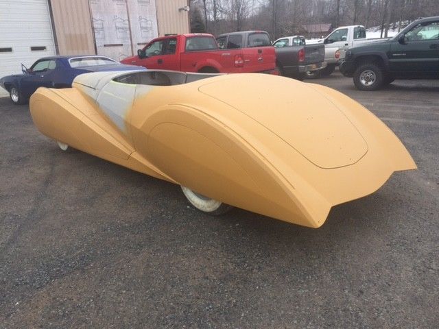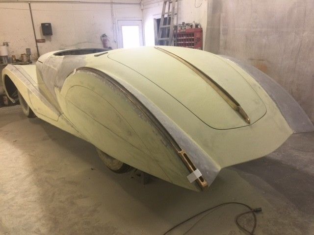 Unfinished steel rebodied custom. Former Editor of HOT ROD Magazine Terry Cook of DELAHAYE USA first saw Ronald Benach's 1948 Type 175s Delahaye with Jacques Saoutchik coachbuilt body, restored by Fran Roxas, at Pebble Beach 2000. (See photo of of turquoise streamliner). Cook was overwhelmed and hired designer and Art Center grad JOHN CASWELL to create a modern day interpretation of a big, fully pontoon fendered car as a tribute to Saoutchik. It was dubbed project SULTAN out of respect for the many cars famed Russian coach builder Jacques created in the 1920's and 30's for Kings and Potentates (some of the most beautiful and most expensive cars in the world.) Photoshop renderings show what completed car will look like. Primered steel body photos show what it looks like now. Starting with his scale drawings, John worked with pro clay modeler Todd Storrs in Detroit to build a 1/4 scale clay model which was then digitized. Working with Steve Wilkonski of Revolution Design in Michigan to create the car digitally, a wood body buck was built at a yacht builder in Thailand. Over several years a steel body was then hammered from that buck by Car Kolor in Saatahip, Thailand. Steel body was shipped to San Bernadino, CA where Little Louie Check hand formed the ornate decorative exterior brass body trim shown. The car is now in master panelbeater Tommy Caruso's shop in Plainfield, NJ having the larger brass exterior trim, the grille, the windshield frame, trunk and interior sculpting done. The unfinished steel body built in Thailand is shown here presently in and grey primer and brownish yellow primer where the preliminary bodywork has been done. The color photoshop renderings of SULTAN attached show a variety of possible color schemes with either chrome or gold plated exterior trim. Customer picks the final colors. The car is being built as a rebodied Bentley with title and matching VIN plate for the firewall so it can be registered as a Bentley. We started with a 1953 Bentley chassis, stripped it to bare metal and added a modern independent front suspension and late model Ford 9-inch rear using coil over suspension. Brown's Metal Mods in Port Leyden, NY completed the chassis and mounted the body on the frame. Firewall, full floorboards, and front and rear wheel tubs were fabricated and installed in the car. We wanted something totally unique so we had John Caswell design an asymmetrical interior with a single driver's seat and a wrap-around couch The trunk compartment would contain custom fitted luggage in the front portion with a hidden space tire well in the floor. The car has a freshly rebuilt twin-carb inline six cylinder Bentley engine and rebuilt Bentley/Rolls Royce automatic transmission. It includes five wheels and wide whitewall tires. The body and one chassis/engine combination or the other is for sale for $150,000 as is, unfinished. Trades considered. Or DELAHAYE USA would like to complete the project for a new owner. We have been working on this car since the last century! This is an enormous car over 18 feet long. Easily the most spectacular undertaking of all the cars designed and created by Delahaye USA. 908 876 9727. $150,000. |