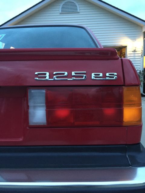 Red BMW 325es 1986 2-door Sedan This car is a beauty with only 90,450 miles and completely original making it rare. There are only some minor scratches in the paint on the hood and one minor ding on the front fender. This car is 100% rust free and interior looks absolutely gorgeous. The back seat has hardly ever been sat in. Has always been garaged and complete records through C&H Auto Repair. The A/C ice cold, ll scheduled maintenance, ell maintained, xcellent condition, ooks & drives great, erfect first car and have the title in hand.Make me an offer willing to negotiate the price.