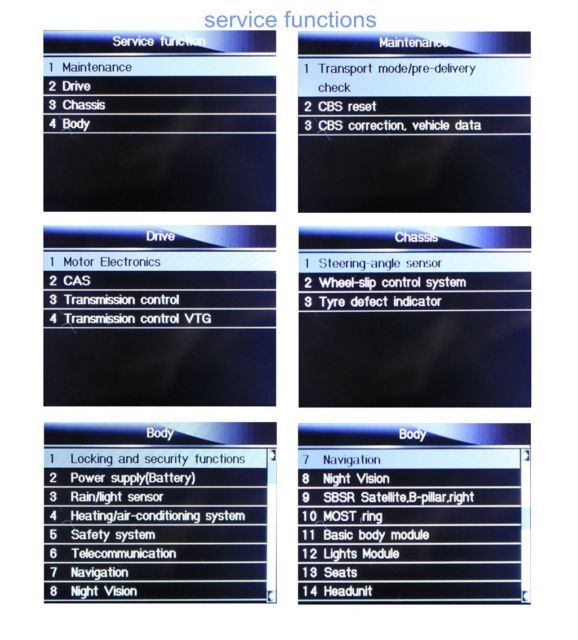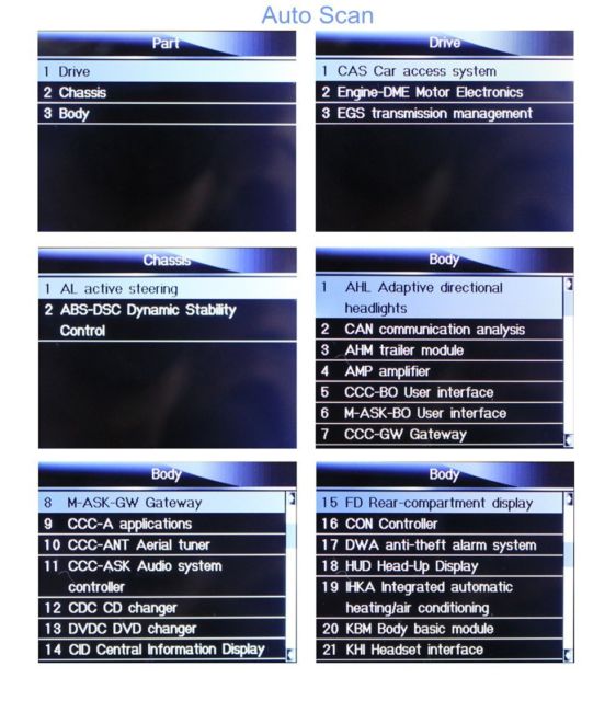 *Certain functions may be limited from the vehicle manufacturer due to the requirement of a special factory access code. Note: This scan tool covers over 25 years of models, so some functions may not be available on all years/models This Scan Tool comes with free updates for 18 months from date of sale. Note: Can only be updated on Microsoft PC's, not with Apple. *Vehicles with 20 pin under hood connector will require a 20 pin adapter ***** Round Port Adapter Required for Vehicles 1987-2000 (sold separately) CLICK HERE BMW MODELS COVERED 1987-Present 1 Series - E81,E82,E87,E88,1M,F20,F21 2 Series - F22,F23,F45,F46,F87 3 Series - E30,E36,E46,E90,E91,E92,E93,F30,F31,F35,F34,F80 4 Series - F32,F33,F36,F83,F83 5 Series - E28,E34,E39,E60,E61,M5,GT(F07),F10,F11,F18 6 Series - E24,E63,E64,M6,F12,F13,F06 7 Series - E23,E32,E38,E65,E66,F01,F02,F03,F04,G11,G12 8 Series - E31 I Series - I01,I12 X1 - E84,F48,F49 X3 - E83,F25 X4 - F26 X5 - E53,E70,X5M,F15,F85 X6 - E71,E72,X6M,F16,F86 Z1 - E30 Z3 - E36,Z3M Z4 - E85,E86,E89,M Z8 - E52 MINI For Most Models 2002-Present Body Styles Covered R50: "Mk I" Mini One & Cooper (2001-2006) R52: "Mk I" Mini Convertible (2004-2008) R53: "Mk I" Mini Cooper S (2001-2006) R55: "Mk II" Mini Clubman (2007-present) R56: "Mk II" Mini Hatch/Hardtop range (2006-2013) R57: "Mk II" Mini Convertible (2009-present) R58: Coupé (2012-present) R59: Roadster (2012-present) R60: Countryman (2010-present) R61: Paceman (2013-2016) F54: Clubman (2016-present) F55: Hatchback (2014-present) F56:Hatchback(2014-Present) F57:Convertible(2014-Present) Rolls-Royce MODELS COVERED RR1, RR2, RR3, RR4, RR5