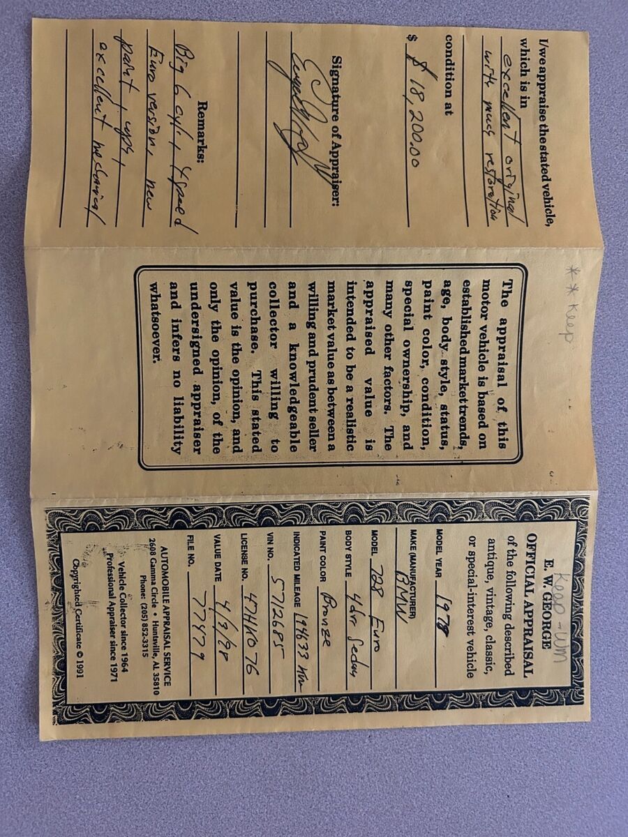 1979 BMW 728 Euro. VIN#5712685 This car was imported from Germany by the original owner stationed there when in the army years ago. There is a story behind it. Total Restoration a few years ago in 1998 or so. And I do mean total, including a $8000 paint job with original BMW color. Plus interior seats recovered with BMW materials imported from Germany. All new headliner, rubber door seals, and much more. They went overboard with new carb, head, radiator, etc. Have written appraisal after work completed at $18,750. It has only been driven occasionally for recreation since that restoration. We have owned it since 2005. Miles 170K. It was not flooded during Katrina. Have all the receipts for the work done since new, too. Interesting stuff to look through, all carefully filed. Professionally maintained by BMW mechanics. Complete records and history on car. Service manuals and other extras. Recently replaced all tires, brakes, stainless brake lines, all components of the emergency brakes, hubs, emergency brake cable, rear bearings, CV transaxle boots. This car is reliable and road trip ready. The only downside is there is no AC running. The equivalent USA model is a 733i so parts are still available. But this unique 1979 728 Euro is the only one we know of in the USA today. It’s a rare bird and especially in this condition. The speedometer is in Kilometers and the dashboard is in German. It has been pampered by all owners. Can provide previous owners names. The first two owners have passed away, all were acquaintances, but one. The car is high performance and fun to drive. This car could make a fine daily driver. We love this car and know it is special. We hope this gets to someone who understands the value and pleasure of driving BMW! Price $9000 |