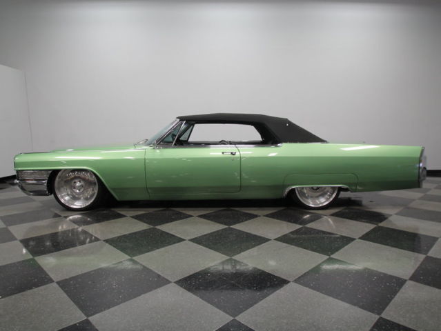 If you're going to wear big wheels you need a big car to carry them and the combination on this super smooth 1965 Cadillac Deville convertible looks incredibly cool. You don't see many Cadillac resto-mods but this one keeps everything that's cool about the Caddy and adds performance and modern style to create a car that gets attention everywhere it goes.All eighteen feet of this super trick Cadillac have been expertly smoothed and beautifully finished to glow like a gem in the sunlight. In 1965 the all-new Cadillac shape was arguably the best of the '60s from GM's top-of-the-line and a few subtle mods enhance the sleek look without erasing the car's identity. The side moldings are gone and somehow the car looks even longer and part of that is the super tight panel gaps; even the fender skirts fit tight and flush. The icy green paint accentuates the sharp creases in the bodywork by changing hue as it moves over the bodywork and the chrome details just pop without being in-your-face. And speaking of chrome there's still plenty of it starting with the wide grille and pontoon-style front bumper with stacked headlights on top making for one heck of a good-looking face. Out back the taillights bumpers and fenders all come together to form one of the most attractive rear-end treatments of the era and yes those white taillight lenses are OEM a vintage trick that's very much in style today. Cool right?The tasteful custom interior capitalizes on the Cadillac's elegance and ties it together with the cool green exterior. The seats are original but they've been wrapped in two-tone leather and door panels were created to match. Bright chrome and stainless was the name of the game in the '60s not fake wood and the brightwork and gauges are all wonderfully executed here. All the Cadillac options remain including power windows and seat a tilt/telescope steering column and enough sound deadening materials to make it Cadillac quiet at speed. The original radio is in the dash sporting its unique knobs both on the left side but the entertainment is provided by an AM/FM/CD stereo system hidden in the glove box which is conveniently located in the center of the dash and in easy reach of the navigator. The trunk is custom finished with black carpets and fabricated side panels that make it look very polished and complete. A black canvas power convertible top is the finishing touch beautifully fitted and elegant with the top up.Mechanically this Cadillac brings the firepower thanks to a 454 cubic inch Chevy V8. The original 429 Cadillac engine was no slouch but this powerplant makes everything this car does feel effortless. The engine bay is neatly detailed and they kept the Chevy Orange block for a bit of contrast which is pretty cool. Lots of new components from the power brake booster to the radiator mean that it's reliable and ready to cruise. A TH400 3-speed automatic is really all you need with that much torque at your disposal and it retains the original rear end with highway-friendly gears inside so it's the car you need for your next road trip. The suspension is lowered three inches but it doesn't seem to hurt the ride quality very much (actually may help) and you can't argue with how cool it looks. Those unbelievable 22-inch chrome smoothies totally make this car's look and they're wrapped in giant 265/30/22 radials that totally stuff the fenders.This car is about sixty different kinds of awesome and you couldn't possibly duplicate it for the asking price. The king of cool is here and it's remarkably affordable. Call now!