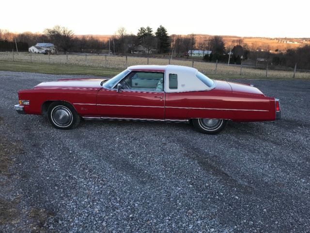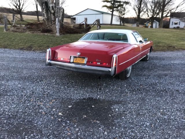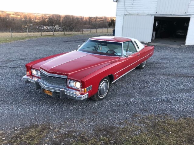 1974 Cadillac elderado coupeRed with white leather interior and white top500 ci motorAir conditioning worksAm/fm 8 track playerNew radiatorRuns and drives great41,000 original milesNeeds work on rust along top and body trimAll in all solid vehicleDriven and inspected yearly |