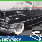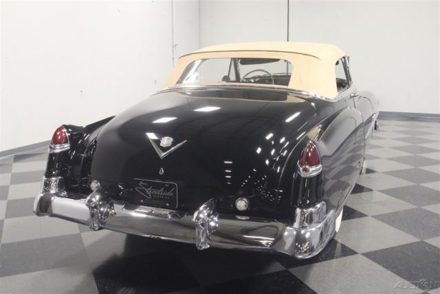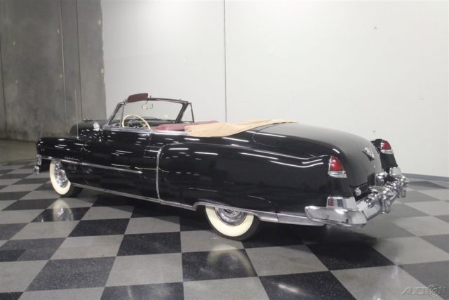 I don't care what kind of car you're into, this 1950 Cadillac Series 62 convertible is a big deal. Home of the first modern short-stroke V8, it ushered in a new era of performance without which the small block Chevy might never have been born. Of course, the fact that it's also one of the best-looking convertibles of the period is only icing on the cake, making it truly as lovely to drive as it is to look at. GM fans will surely be happy to note that the glossy black paint on this '50 has a period-correct look, which only comes from age. It's not original, of course, but the finish is about 30 years old, so it has a wonderful soft shine that works extremely well on the curvaceous Cadillac bodywork. Tailfins were in their third year and they were a major hit with the car-buying public, and there are more than a few enthusiasts who regard the early P-51 inspired look as the finest of them all. The 1950 Cadillacs were significantly changed from the 1949s, but it was still the envy of the industry and Cadillac was able to sell every car they could build that year. The restoration is holding up very nicely and still looks great cruising down the road or at a show. Panel fit is excellent and the doors close with a remarkable solid thunk that you just don't get today, and it's even more remarkable that this is a convertible, not a sedan. Chrome was a big deal in 1950, and thought it would be expensive to make perfect, it's in very good condition and it looks right on the car today. Nothing radical inside, either, just pure elegance. Pleated red leather seats front and rear offer seating for six in a pinch, and make no mistake, this is a very big car. The leather is original and beautifully preserved, while the body-colored instrument panel with its light accent band shows some aircraft influences that were popular after the war. A ivory plastic steering wheel with horn ring provides first-class control over the machine (cracks are inevitable after all these years) and yes, this is a Hydra-Matic car, which works well with the power windows, top, and even power seat, to provide a very luxurious environment. The original AM radio is still fully operational and there's a full array of instruments below the oversized speedometer. The tan top folds quickly and easily, and the trunk is nicely finished with original mats and a full-sized spare tire. The 331 cubic inch OHV V8 in this Cadillac was truly revolutionary. 200 pounds lighter than the flathead it replaced, it made more power and torque and got better fuel economy. With its shorter stroke, it didn't mind revving and pulled the heavy luxury car around with real authority. Original Cadillac Blue engine paint, white script on the valve covers, and all the original accessories make for a nicely preserved engine bay that looks right for its age. Now before you dismiss the early automatic transmission, take it for a drive. Remember that it has lower gearing in first and second to really rocket off the line and out back, there are lower 3.36 gears, making it a superlative highway cruiser. Honestly, if you want a 50s Cadillac, a Hydra-Matic is the only way to go. It also sounds great with a single exhaust and modern L78-15 whitewall tires provide a vintage look. This is a very big deal car, and 1950 Cadillac convertibles don't come on the market very often. This is the godfather of all performance cars, clothed in some of the most dramatic sheetmetal of the era. Call today!