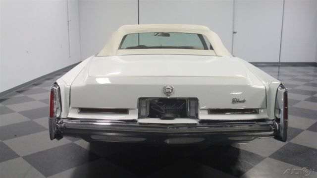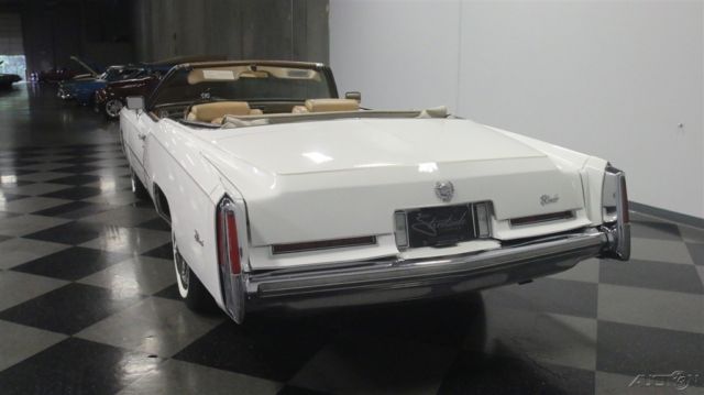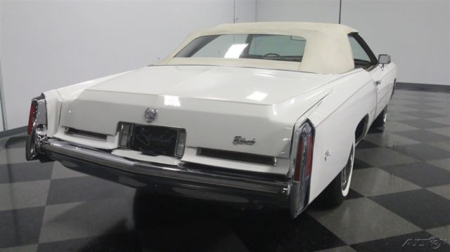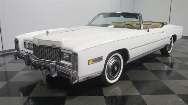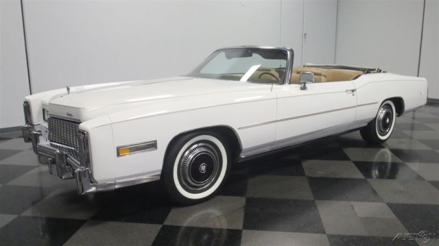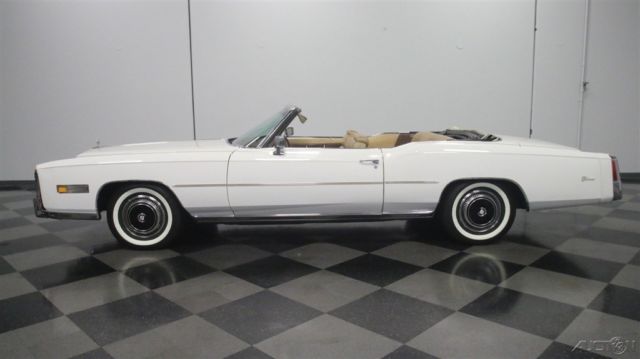 If you put a 1976 Cadillac Eldorado convertible away for posterity, now is the time to cash in. These big ragtops, including this nicely preserved Cotillion White example, are finally getting the respect they deserve. With a gargantuan V8 and enough sheetmetal to make sixteen Smart cars, there will never again be a convertible like this. If you're going to own an Eldo, the '76 is definitely the one to seek out. Fender skirts were gone, so it has a more balanced look that isn't so bottom-heavy, and the stylish bumper ends front and back give it a smooth profile. This one appears to be wearing an older repaint, which could almost pass for original paint if we weren't picking nits. The front and rear fender caps have been replaced since the originals usually crack with age as the flexible plastic deteriorates, and the paint match is quite good so nobody will know. As a lifelong southern car, there's no critical rust damage (obviously) and the paint still has a great shine that needs nothing more than a quick wash and wax to look its best. Chrome trim is also excellent, with bumpers that fit tightly to the bodywork and details like the flexible plastic trim strips that outline the rear bumper extensions that are often missing. And since this car has an unusual tan interior, there's a tan insert on the rub strip as well as a matching gold pinstripe. Acres of tan leather (which Cadillac called "Buckskin") provides a great contrast to the white paint that's a bit more subtle than the more common red interior. It's as nicely preserved as the rest of the car with supple hides on the seating surfaces and only modest wear on the carpets thanks to a set of custom embroidered floor mats. The door panels are in excellent shape, including the arm rests which are notorious for cracking and splitting, and the woodgrained trim and upper padded areas still look great. This Eldo was loaded with just about every option you could get, including a power seat, automatic climate control (ice cold A/C!), cruise control, interval wipers, and a power antenna. A modern AM/FM stereo slots neatly into the dash and makes this the ultimate road trip choice, and with the big trunk that's not compromised by the folding power top, it'll carry all your gear, too. And speaking of the top, the white power scissor top folds neatly and includes a glass rear window. Cadillac's big 500-inch V8 makes the kind of effortless torque you'd expect for a land yacht this size. It turns slow but once it gathers a head of steam, it'll happily cruise all day at 80 MPH with the A/C blasting. It's extremely clean under the hood and defies its age and mileage with careful ownership and proper maintenance. The TH425 3-speed automatic drives a set of 2.73 gears through the front wheels, so the big Eldo feels light on its feet and pulls through corners surprisingly well. A new single exhaust system ditches the restrictive catalytic converter probably adds a bunch of horsepower and four-wheel disc brakes are surprisingly effective. The original wheels wear hubcaps with correct black centers (a 1976-only feature) and wear 235/75/15 whitewall radials. Big ragtops like this will always be fashion statements, and the last of the 500-inch Eldos are only going to get more desirable in the coming years. Call today!