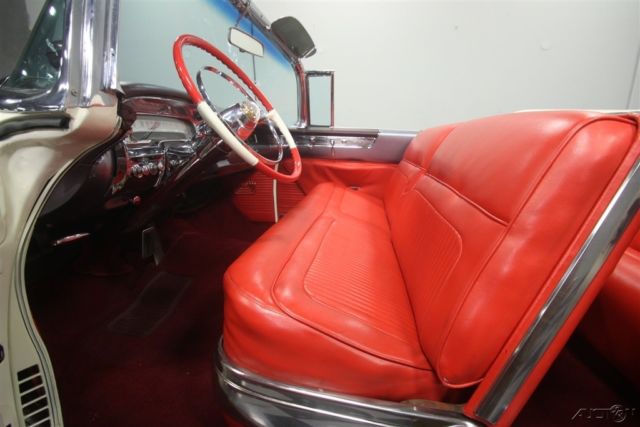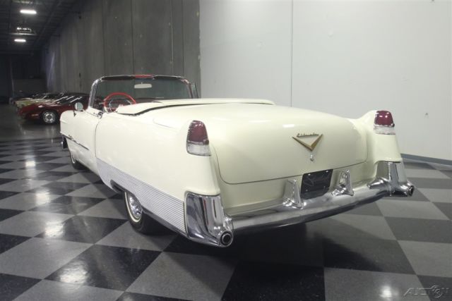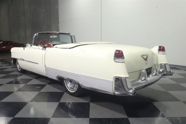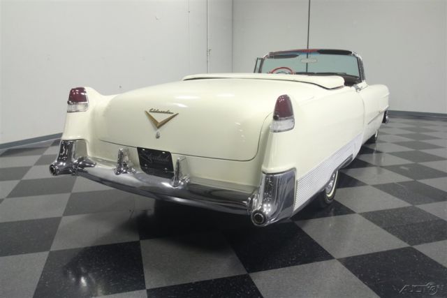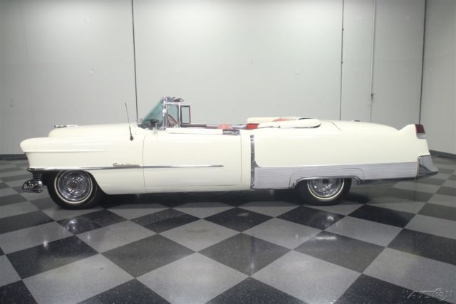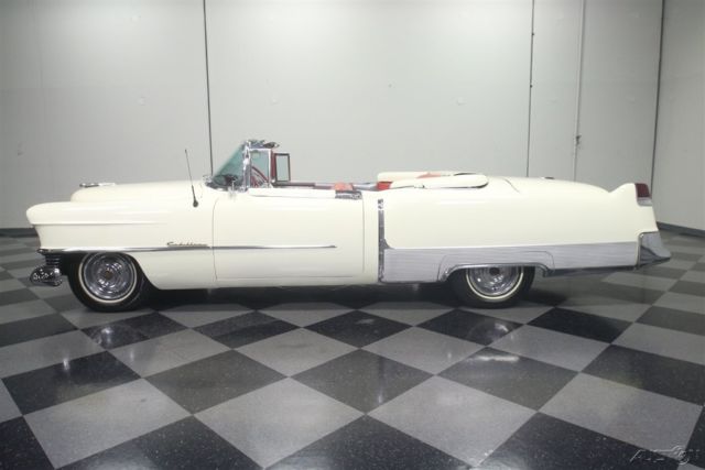When GM wanted to make a big splash at the 1953 Motorama, they introduced three limited-edition convertibles: the Oldsmobile Fiesta, Buick Skylark, and Cadillac Eldorado. In 1954, the Eldorado became a permanent part of the Cadillac lineup and represents what many collectors think of as the ultimate '50s heavy cruiser. Code 18 Alpine White was the same color as the Motorama Eldorado, so obviously it was the most popular with customers. It's a soft, creamy white, not a hard refrigerator white, and it looks absolutely spectacular on the sleek Eldorado. It was restored quite correctly and all the unique original Eldorado pieces are still in place, including the signature anodized trim on the lower quarters. These cars are insanely expensive to restore and you certainly couldn't put a basket case into this condition for the asking price, making this Eldo somewhat of a bargain. The doors fit well, the paint shines like it would have in 1954, and it's obvious that a lot of money was invested to get it here. Many of the parts are unique to the Eldorado, which means this has always been a complete car and from the pointed front bumpers to the P51-inspried tailfins out back, this car defines Cadillac style. The red interior provides the ideal contrast to the Arctic White bodywork and includes just about every comfort and convenience item Cadillac could install in 1954. The upholstery is in excellent condition and there's plenty of chrome to offset the details on the exterior. The two-tone steering wheel is pure style and frames a nicely detailed instrument panel that includes a massive speedometer and more shiny chrome trim. That pod on the top of the dash is the Autronic Eye, a primitive high-beam dimmer system, and this car also includes features like power windows (the rear windows need new motors, although they do go up and down). You'll note the radio is missing, but you could either upgrade it to something more modern for cruising or pick up an original Cadillac AM unit. Overhead there's a black power convertible top that's in fantastic condition and it stows under a color-matched white fiberglass parade boot for a very clean look. And as a Cadillac, you know there's a giant trunk, with this one carrying a full-sized spare and a reproduction mat. Cadillac's 331 cubic inch V8 was the most powerful V8 you could buy in 1954 and it moves the massive ragtop without a lot of effort. The engine runs great and was detailed a number of years ago, so it looks right with no modifications. A 4-barrel carburetor offers good throttle response and both power steering and power brakes were standard equipment (probably mandatory on something this big). Cadillac Blue paint on the block, a familiar dual-inlet air cleaner, and an original generator making the electricity. It starts easily and has a muscular but muted note from the exhaust pipes, just about right for a top-of-the-line Cadillac. The Hydra-Matic 4-speed automatic transmission shifts properly and this car will cruise all day at modern highway speeds. The chassis shows well enough, but obviously this Eldorado was made to be driven, so you don't have to fret about road rash or rain, which is always a relief. Just about the only external modification are those 235/75/15 whitewall radials, but just think of how spectacular this car would look on a set of wide whites! Ready to enjoy now and with a few finishing touches and upgrades, this could be a vastly more valuable car. It isn't often that we find a car where there's financial upside, but this Eldorado offers the smart collector a great opportunity at a great price. Call today!