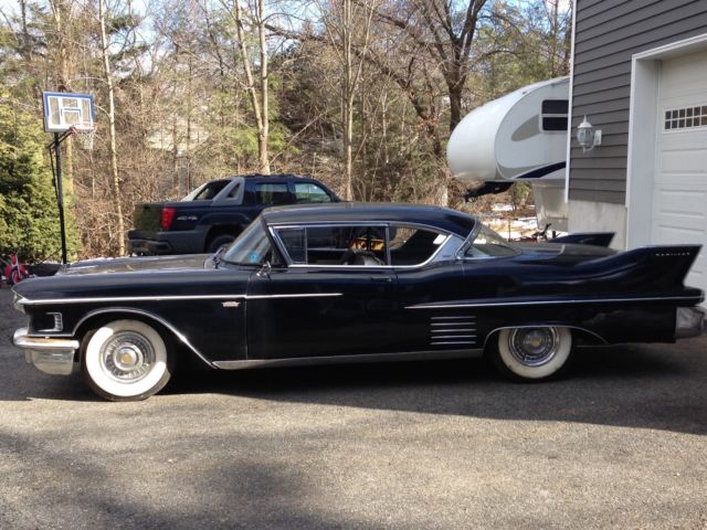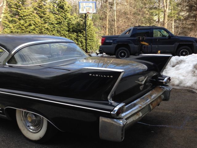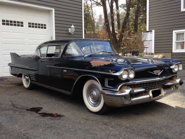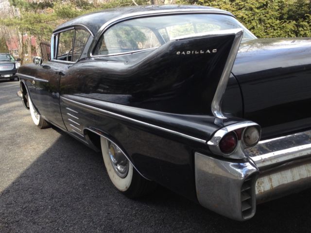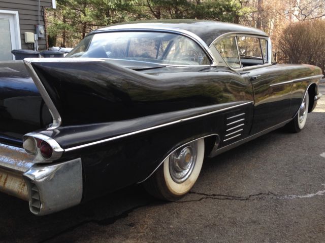 1958 Cadillac Coupe 2 door. Tuxedo black with a black and white interior. Has been stored in a warehouse for the past 25 years. Solid car. floors. frame all original body panels. numbers matching. Very minimal body rust as to be expected. Good restoration candidate or drive it as it is. The brake booster is locked up and a transmission line is leaking. Runs good. brand new battery. tune up. fuel filter etc. Call or text for any questions or more info 914---879---9496. This is a CASH ONLY sale. Also available for sale but NOT INCLUDED with the car are the following:-Right front fender complete w/ trim and inner wells-Left front fender complete w/ trim and inner wells-Hood complete minus the front embelm-Radiator support -Door passenger side complete with door panel-Front bumper complete with grille-Door Panel Driver inner metal upper-Door Panel Passenger inner metal upper-Some misc trim or moldings and a starter
