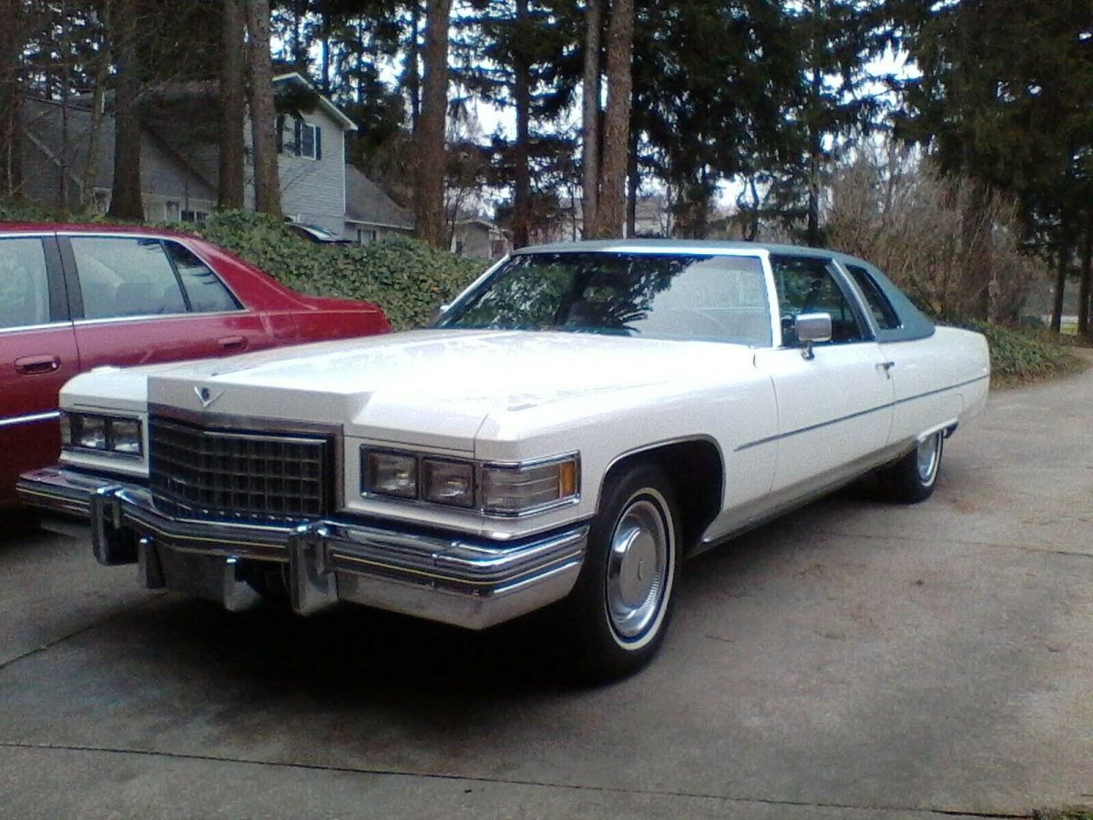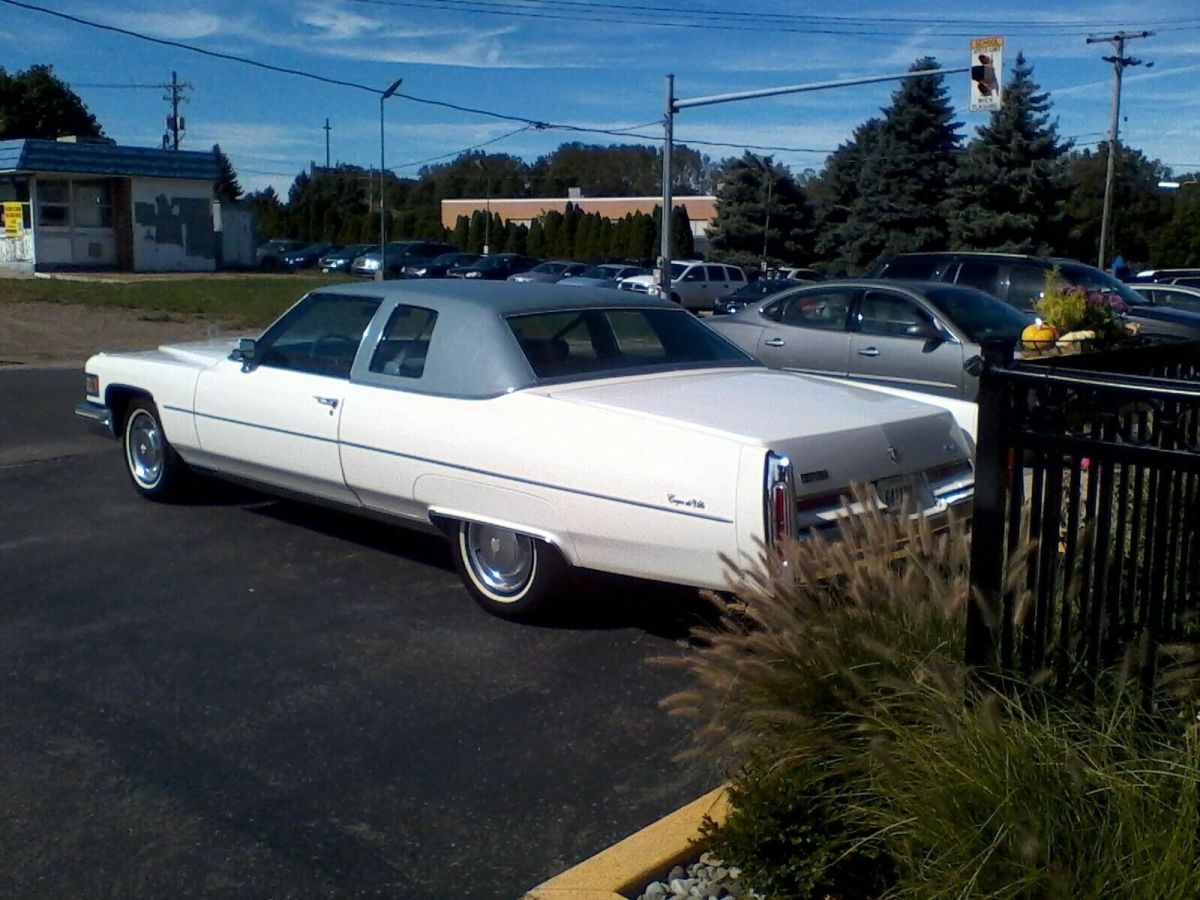 This is a 1976 Cadillac Coupe Deville up for bids. Just over 47,000 miles on the clock. Finished in what I believe to be the original cotillion white finish. I will be as comprehensive as I can with the description of the very few quirks that need attention to be a definate number 2 car. * the front brakes tend to "grab" at very low speeds such as in parking maneuvers. They smooth out at higher speeds* There is a hole in the muffler. A new muffler is included. The rest of the exhaust including the manifold and catalytic converter are A1* The climate control through the settings good. Responds to the temp dial. The AC compressor clutch engages but I don't think the air out the vents is very cold.*The AM/FM stereo/8track turns on and the stereo light goes on and off as you tune . And the power antenna works as it should. But there is only a faint sound from the speakers. I past experience the speakers need replaced or rebuilt*The left rear bumper filler was replaced by an amateur evidently. But the piece can be remanipulated and refinished* Digital clock ran for 6 hours a couple years ago, not since or before. Kinda weird.* Two tiny rust spots on the left rear quarter panel* Needs a driver side power door lock actuator. both buttons only raise and lower passenger door lockRuns great. No issues with suspension, steering, tires, transmission or engine (500 CU I, thm 400) . All lights work including sentinel (delay) and the lighted door handles.no phone calls please. Im a driver. thanks