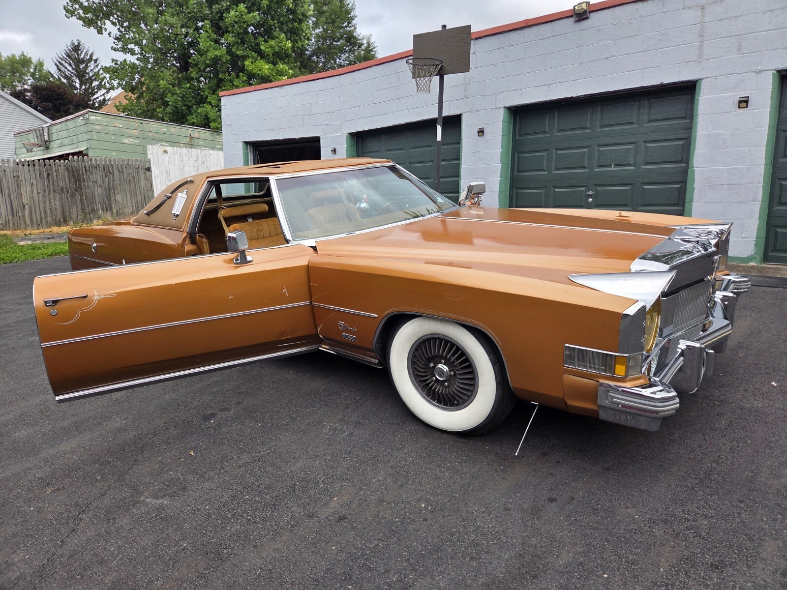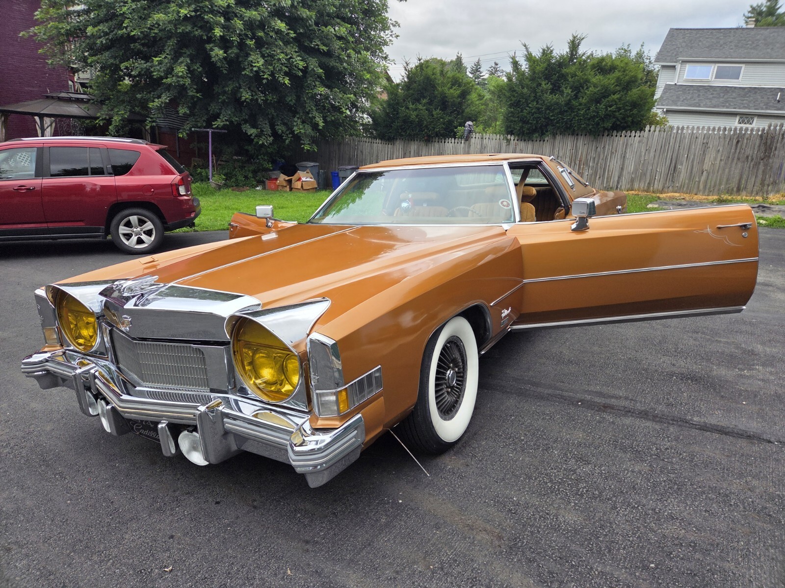 74 Eldorado built by Moloney Coachbuilders of Illinois, Superfly headlights were added, big chrome hood cap, fog lights, curb feelers, 4 inch Coker whitewalls, Rocket aluminum wheels, rear air shocks, new starter, new battery, runs great only 38,500 miles, trunk hump, landau bars, limousine style side opera lamps, working power sunroof, velour interior, glides down the road, not perfect, some scratches, dents, and rust but not bad considering 51 years old, rechromed front fender extensions, 500 engine, goes anywhere, been to PA, NJ, NY car shows, also has a siren pimpmobile