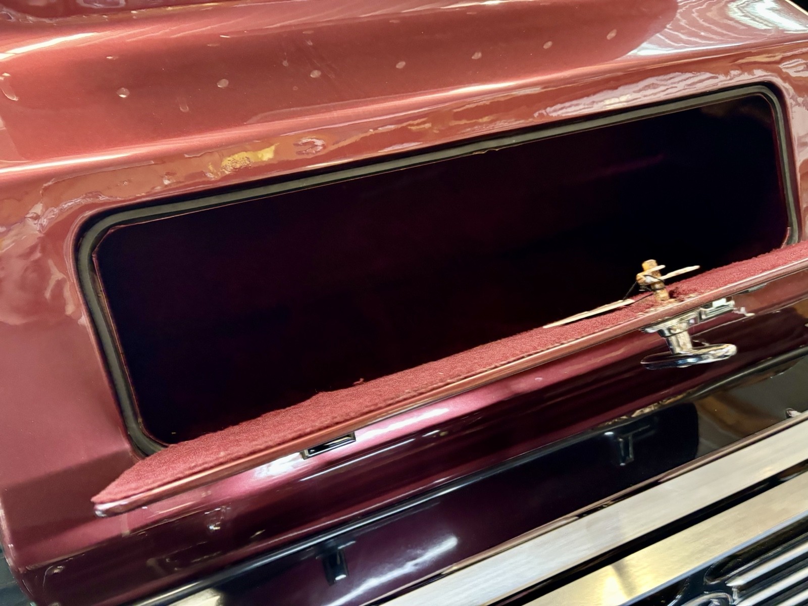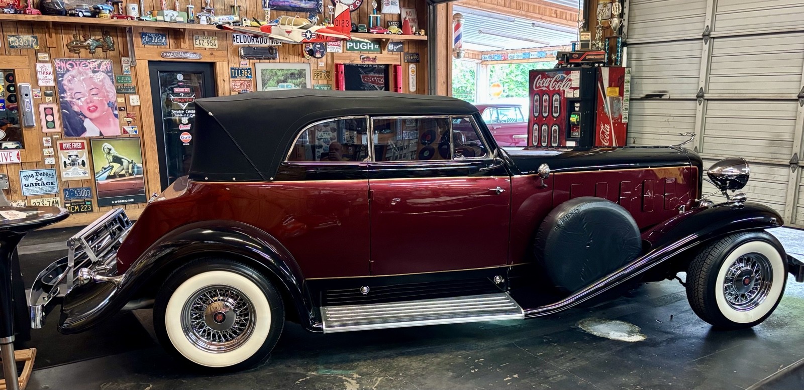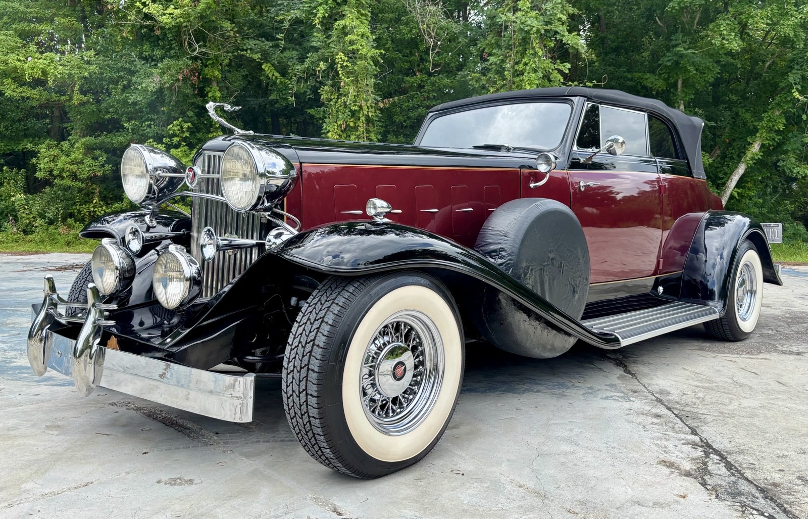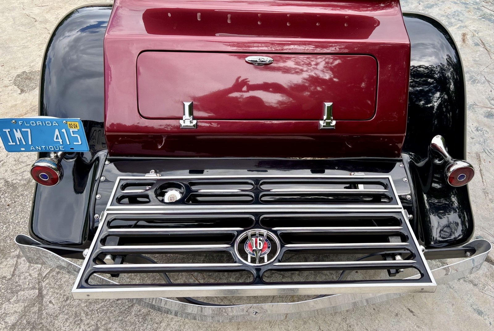 1932 Cadillac 2dr Convertible fiberglass replica. Vehicle Details Stunning Corinthian Maroon & Cannon Smoke exterior paint with a very nice, tight black top and suicide doors. Plush leather and tweed inlay interior in burgundy and grey. Strong running 429 cid with a Demon 4 bbl carburetor. Nice shifting C-6 automatic transmission. Power steering, power brakes, power windows, ice cold A/C, Bluetooth AM/FM stereo. Lots of chrome and polished aluminum under the hood. Kelsey Hayes chrome wire wheels with Coker wide white wall radial tires. Chrome luggage rack on rear of car. |
