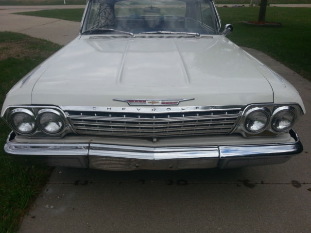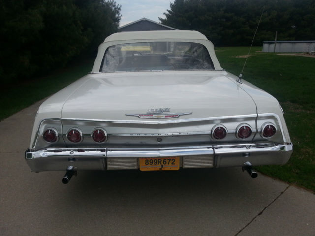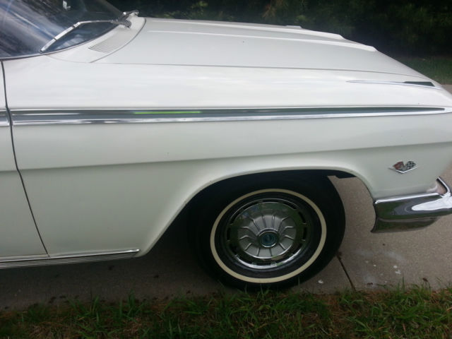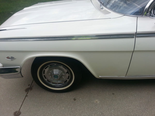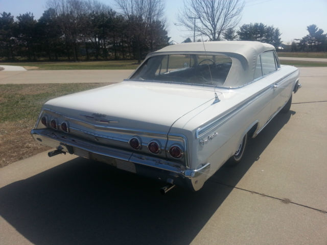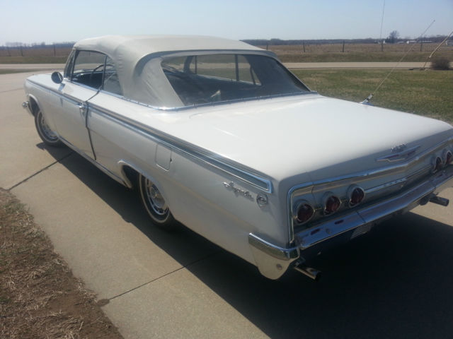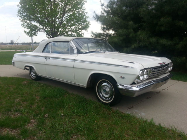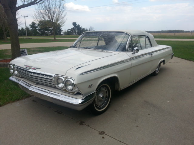 Up for auction is a running & driving 1962 Chevrolet Impala convertible. You can drive this car as you are fixing it up. I bought this car from the original owner last month with intentions of doing a complete restoration on it. However. my situation has changed & I must now sell it. I will probably regret selling it. but life happens. I have the cancelled original Iowa title for the car as well as the dealer worksheet from when the Husband & Wife purchased the car. I also have a notepad of maintenance that was performed on the car through the years. I had driven the car only about 3-4 miles to my garage & out into the driveway for pictures. It drives well. The brakes work well & don't pull at all. The clutch is in good condition & doesn't slip. The 327 runs good & there aren't any abnormal noises coming from the car. The odometer reads 75290 miles & I was told by the original owner that it is correct. The tires on the car are radials with like new tread. The interior is okay to fair. The back seat is in good condition & the front seat material has come apart at the seams. The carpet is worn. Rear side panels are good & the door panels are in bad condition at the bottom. The dash is real nice with nice clean gauges & nice trim. The top looks to be in decent condition with no holes & the back window is still clear. The power top cylinders have been unbolted from the top frame quite a while ago because it operated good in one direction but not the other per the original owner. The top frame is in real good condition & operates smoothly by hand. The outside of the car has had body work done by the original owner using fiberglass & bondo on the lower quarters. The doors appear to not have any rust other than a little surface rust along the bottom but no rust through. The front fender on the driver side has had a small bit of rust repair but is very usable. The hood & trunk lid look good as do the front inner fenders & core support. The lower quarters. rockers & floors should be replaced to do it right. The trunk could probably be patched as the trunk-well is good. All the trim on the outside of the car is in really good shape. The only trim that has dings is on the trunk & the hockey stick by the drivers taillight. Almost all the pot metal trim is in really good driver quality condition also. The exception being the bright trim that runs between the taillights has some pitting. The drive-train consists of a 250 horsepower 327 engine with a 3-speed manual transmission shifted on the column. I checked the engine numbers & it is the original engine to the car & this was confirmed by the original owner. The exhaust was replaced quite a while ago but the car hasn't been driven hardly since & it still looks to be almost new. I have a reserve on this car but it is set low & I have no doubt it will be met early in the auction. I am NOT going to reveal my reserve or end the auction early. If you have a question about the car I will be more than happy to answer it. Give me a day to respond & keep in mind that if you ask at the very end you may not get a response in time. If you would like to discuss the car send me your phone number with a time range in which to call & I will call you back. The winning bidder will be required to pay a $500 deposit through PayPal within 72 hours from the end of the auction. The balance is to be paid in cash when you pick up the car. If you would like to pay by a personal or Cashier's check that is fine however you will need to send it to me. I will deposit it into my account & the funds must clear before you can come to get the car. This usually takes 7-10 business days so please keep that in mind if paying by means other than cash. Again. If you have cash I will sign the title over to you & you can take your car at that time. I would like to have the car picked up within a month from auctions end. It will be stored in my garage until it is picked up. I have 100% perfect feedback & plan on keeping it that way. I have sold a few cars here & have never had an issue. If you are the winning bidder I will make this transaction go as smoothly as I can on my end. Thanks for looking at my Impala & Happy Bidding!