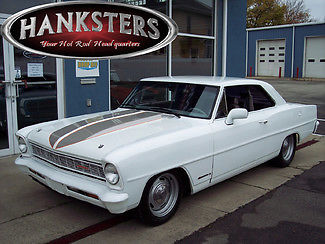 DescriptionClassic car insurance starts around $25/mo for a $25. 00 vehicle Stock # 67NOVA2472White 1967 Chevrolet Nova Pro Touring Coupe ExteriorWhite exterior with Silver Stripes on hood and deck lid with Orange pinstripingFiberglass 2 inch cowl induction hood15 inch Rally wheels205/60R15 on the front and 235/60R15 on the rearInteriorGray tweed custom interiorPower front bucket seats with headrestsFactory dash with 120mph speedometer. fuel gauge and clockAftermarket Auto Meter gauges include water temperature. tachometer. oil pressure and voltmeter gaugesPremier by Pioneer AM/FM/CD playerAftermarket AC unit installedRemote mirrorsCustom center console with automatic floor shifterBillet aluminum steering wheel with leather wrapTilt wheelCruise controlDrivelineRam Jet 350ci GM Performance Parts fuel injected engine700R4 automatic transmission with overdrive10-bolt Eaton POSI rear axle and housing with 3. 08 gearsAdditional OptionsAluminum intakeAluminum water pumpAluminum radiator with billet aluminum overflow tank and electric fanPower front disc and rear drum brakesFREE SHIPPINGHanksters offers Free Standard Shipping on every vehicle in stock to all of our customers within the U. S. Offer only applies to full retail price offers to customers within the 48 Contiguous States. Affordable Financing and Worldwide Shipping Available. For questions. please email or call. We have several classic cars in stock. please contact us directly for the most current list of inventory. Hanksters. its agents or employees shall not be held liable to anyone for any errors. omissions or inaccuracies under any circumstances. The entire risk for utilizing the information contained on this site or linked to this site rests solely with the users of this site.