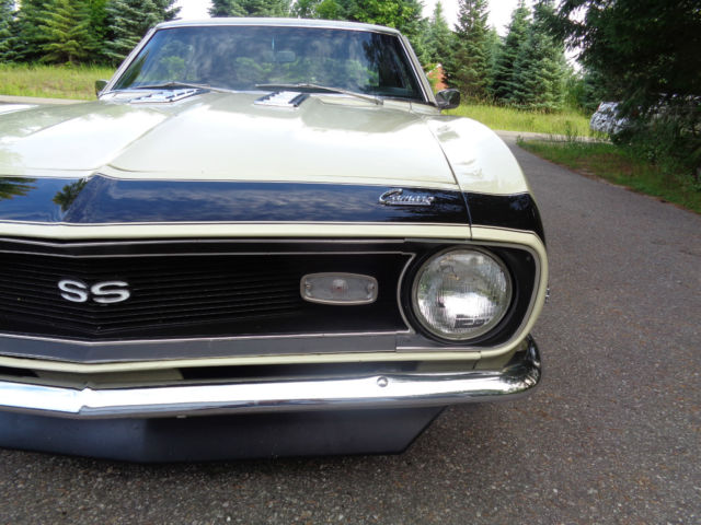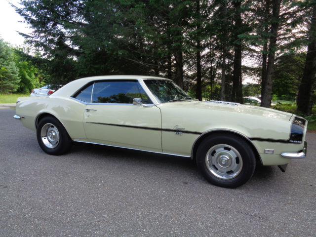 1968 CAMARO SS 396... FACTORYSS 396 BIG BLOCK CAR . THE BLOCK IS PERIOD CORRECT, HE CAR WAS BORN WITHA 396 4 SPEED, nbsp;IT HAS A AUTOMATIC NOW. I DO HAVE THE MUNCIE 4 SPEED, nbsp;NOT SURE IF ITS THE ONE THAT CAME WITH THE CAR ORIGINALLY. THE CAR STILL HAD THE CLUTCH PETAL (removed) AND THE SMALL BRAKE PEDAL STILL ON THE CAR. IT HAS THE ORIGINAL 12 BOLT POSI3.73,POWER STEERING AND POWER FRONT DISC BRAKES, RIGINAL EXHAUST MANIFOLDS. IT REALLY SOUND AND RUNS VERY WELL. THEDELUXE INTERIOR IS VERY NICE ALONGWITH THE CARPET, nbsp;DOOR PANELS, DASH PAD, nbsp;HEADLINER. THE INTERIOR IS EXCEPTIONAL. IT DOES HAVE THE FACTORY TAC AND CENTER CONSOLE WITH GAUGES. EVERYTHING WORKS, OURTESY LIGHTS, ASH LIGHTS, ONSOLE LIGHTS, AUGE LIGHTS, nbsp;EVEN THE DOOR BUZZER WORKS. THE EXTERIOR COLORIS VERY RARE!! PALOMINO IVORY,LESS THAN 1% (.08%) WERE PRODUCED. ALL THE BODY LINES AND GAPS ARE GREAT, LL THEPANELS ARE STRAIGHT WITH NO RUST OR PAINT PROBLEMS. THE FLOORS ARE SOLID ( see pictures) THE TRUNK IS ALSO SOLID. THE FACTORY 15" RALLY WHEELS AND TIRESARE EXCELLENT. ALL THE CHROME IS EXCEPTIONAL. THIS CAR IS NICER THAN A DRIVER. IT RUNS, RIVES AND SHIFTS NICE...IF YOU HAVE ANY QUESTIONS YOU MAY CALL 231-330-2079 OR EMAIL ME. THANK YOU...