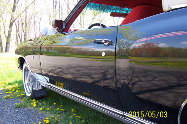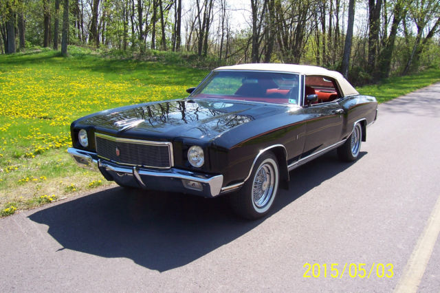 YOU'RE RIGHTGM never made a convertible Monte Carlo (actually they did, ut they scrapped it...decided it wouldn't sell) but this is the next best thing to it but the last time I ran this add, eople wanted to buy it if it was a convertible but remember gentlemen and ladies, t is made to look like a convertible with bows etc. So you are looking at a 1971 Monte and please scrutinize every picture...This ebony beauty is cruising down the road with a 350cu. in. geared by a T-5 five speed overdrive tranny with only eleven thousand miles on both gear box and engine. Suspension is mostly new fromstem to sternwhich can be seen in the pictures. Wheels are 15inch on chrome wire basket centers. The console is hand made out of mahogany and the dash expresses itself via the pictures once again. Speaking of pictures,note the "mirror effect" in some "piks" showing the background of trees, rass etc. No "ten footer here"...the black paint isnear perfect. I consider this automobile to be refined and sculpturedin timeless good taste and if you're looking for something different, ake the time out of your busy day to view all the photos..it is well worth it..and by the way, installed a polished stainless "mirror" on the underside of the hood with the Monte Carlo emblem embossed on it which only adds to the magnificient lines of this first generation Monte Carlo!