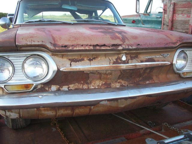 OFFERING A 1963 CORVAIR 2 DOOR. Pretty complete car, as some rust in hood, ront lower valance panel, loor board need complete replace but cross members ok. rest of car has surface rust was a gold car. fenders, oor, uarter panels pretty decent. top good, lass good, nterior all there buckets, eeds redo all inside. deck lid good, umpers good, ites good, ave4 hubcaps, ires are junk, ngine compartment good, ooks like all the motor there. Car doesNOT have a title, ut well come with anotarized bill of sale. would be a great restoration or excellent parts car. rolls fine. easy load. cAR SHOWS 57000 miles on speedo...probably over 100000. Don't know for sure. Payment paypal ...if you win I well send you a invoice after I contact you. car paid in full within 7 days auction end. Shipping up to buye, et up your quotes before bidding ....I also have a man that hauls for 1.00 a mile. to your door. shipping is between you and the shipper. ship cost is to buyer 30 free park till shipper picks up |