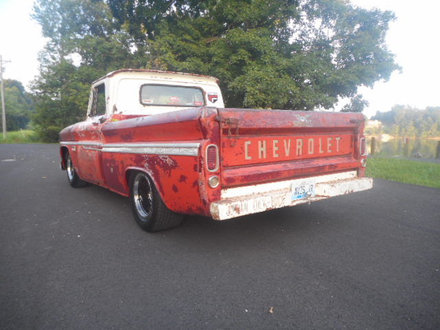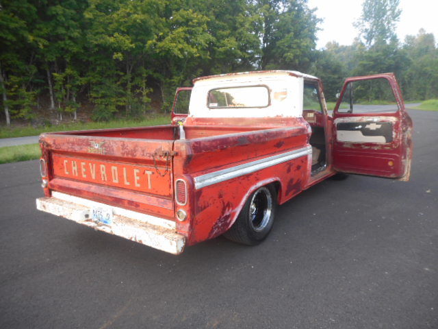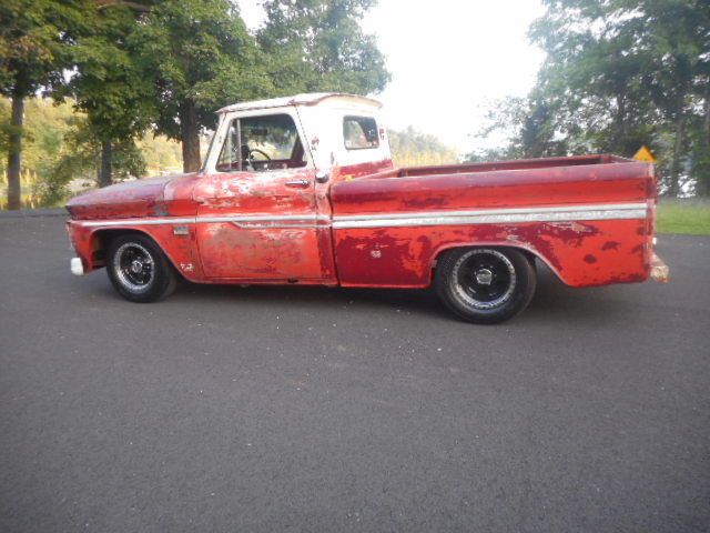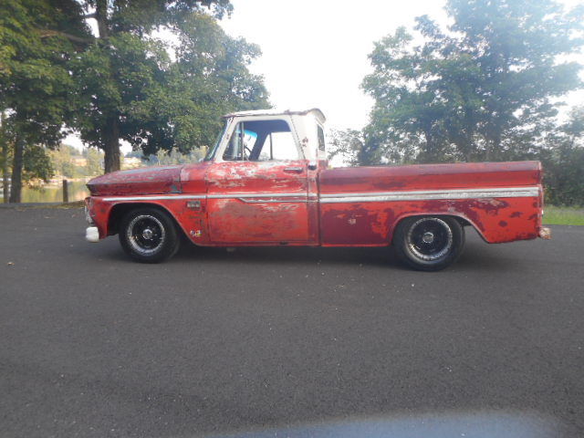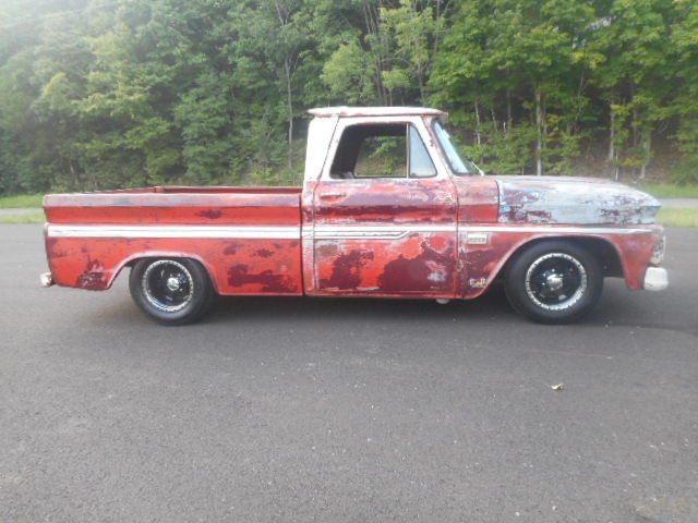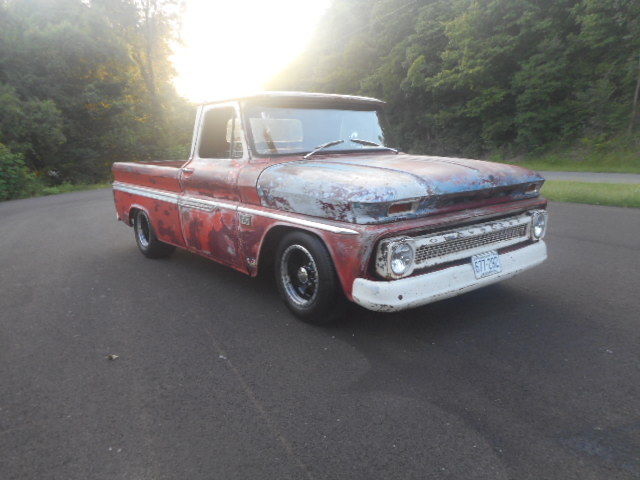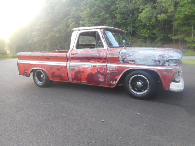 You are viewing a 1966 C10 Rat Rod truck. Truck has a little rust on rocker panel and front fenders, s seen in pictures, nd a little on the rocker panels. Like I said, his is a Rat Rod truck. I will start with the engine. It is a brand-new GM Goodwrench crate motor with Promax aluminum heads, luminum intake with new 600 Holley, omp cam, pecs are 274 286-490 490. Everything on this motor is new from oil pan to carb. When installing the motor, nstalled new clutch, ressure plate, hrow-out bearing and seals in transmission. The truck was built to be driven daily and for dependability. Interior has new upholstered seat, ew carpet, ew door panels, nd door jam protectors. Also installed new window regulators, ill need two window crank handles. The ones I purchased the splines were too big to fit the regulators. For the outside of the truck, t has original Patina, uper solid truck with very little rust. All gauges and electrical work, ven up to the dome light. Truck does not have blinkers or heater. Truck comes with two sets of wheels and tires, nes pictured are brand new with 235/70/15 on front and 15X8 wheels, ear has 295/50/15 setting on 15X10 wheels. I have the factory wheels with nice beauty rings and baby moons, ires have over half tread. I built this truck this past winter for my son. He is now wanting a newer 4WD. Like I said, his truck was built for dependability and can drive anywhere. Truck has lowering springs on front and is bagged in rear. I am the first titled owner of truck. Truck came from Mississippi new.