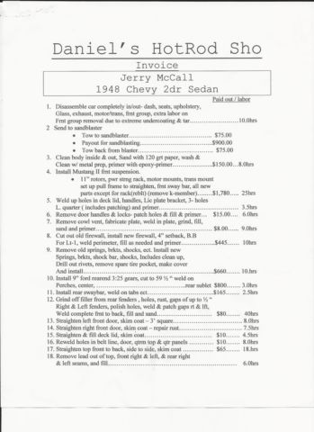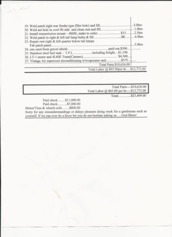 | Please see attached Invoice from Daniel's Hot Rod Shop for details on what's been done to the car. Also, please see attached pictures of the car and miscellaneous parts. If it's not in the pictures, don't have it!I would be glad to answer any questions you might have. Phone: 435-414-6110 ask for Jerry. I will not end the auction early, o don't ask. |