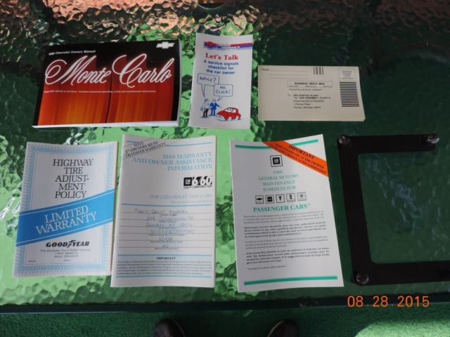 1988 Monte Carlo SS with 2177 ORIGINAL miles Like they say, hey're only original once. Completely documented with original window sticker and all GM documents including sales brochure. 2 owners that only took the car to shows. The ONLY non-original part on this car is the battery, hich was replaced with a similar A/C delco unit. My reasonable reserve reflects the condition of this car, o bid accordingly. ANY questions, eel free to ask. Please, erious bidders only. I'm happy to answer questions regarding the condition of the car, hort term storage, tc. Please don't inquire about my reserve. I prefer to let the auction go the complete distance, owever, rior to the reserve being met, may accept a reasonable offer. This is a cash sale, o please have your funds in order PRIOR to bidding. If you need permission from anyone, lease do so first. |