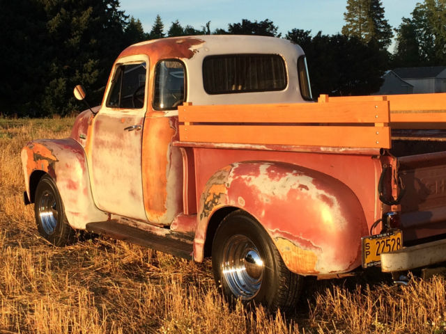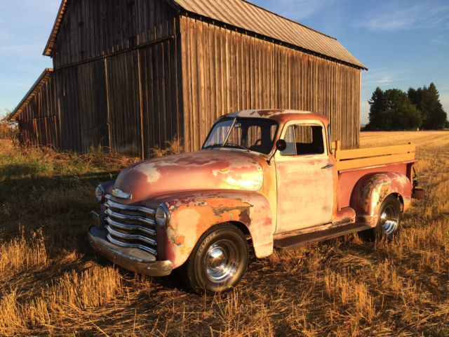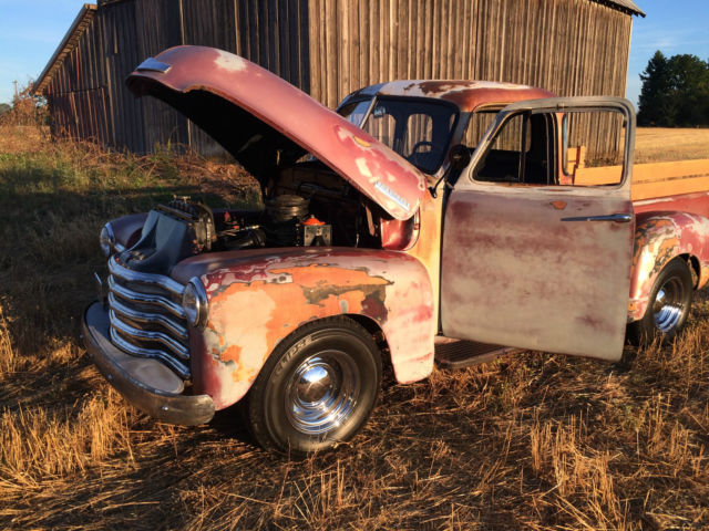 One owner prior to me 1951 Chevrolet 3100 5 window short box, eautiful patina and runs smooth, 16 6 cyl with 4 speed on the floor, ompletly original drivetrain, ll new glass, oor seals, ent seals and window seals, ew brakes, ew tail lights and turn signals,rebuilt carb, omplete interior restored to stock which includes a completely rebuilt and restrung seat, actory floor mat with sound deadener, ew door panels, eadliner, un visors, ew and correct rubber pedal covers. Brand new solid oak Mar-K bed with stainless fastenerswith new wood and rubber correct bed mounts, ustom made CVG fir bed racks, ew tireswith reversechrome baby moons, verything on this truck works, ll the guages and even the dome light. Its still the original 6 voly system with a new battery and generator. This truck lived its whole life in Madras Oregon and was the parts truck for the Chevrolet dealer there. It's a beautiful truck and drives great. It has lifetime Oregon plates and an original 1951 plate on the front, ots of character to say the least. This truck has just been completely serviced, ll the fluids drained and filled, ew brake fluid, oolant, ngine oil, ransmission and rear-end. All original lube points greased, ing pins tight, ebuilt the brakes and radiator, oses and beltsreplaced in 2014. Even the original heater and fan work as they should.