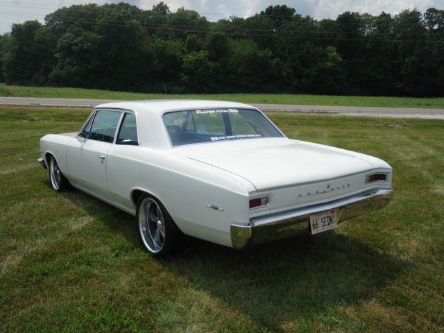 1966 CHEVELLE 300 DELUXE 2 DOOR SEDAN. 408CI SMALL BLOCK FLAT TOP PISTONS COMP XE284H CAM COMP PUSH RODS DART HEADS SCREW IN STUDS GUIDE PLATES CRANE GOLD RACE ROLLOR ROCKERS 650 HOLLY PERTRONIX HEI IGNITION PUMP GAS MOTO, AS MARCH SERPINTINE PULLIES AND BRACKETS, ROW ALUMINIUM RADIATOR, LECTRIC FAN. HEADERS AND 2.5" EXHAUST FLOWMASTER, THE CAR IS RAN WITH AMERICAN AUTO WIRE CLASSIC UPDATE HARNESS FROM HEADLIGHT TO TAILLIGHT. TRANSMISSION IS A BUILT 700R4 4 SPEED AUTOMATIC WITH A 2200 STALL 200RPM AT 65MP, SHIFT KIT REAREND IS A 1966 CHEVELLE 12 BOLT 411 POSI TRAC SUSPENSION CONSIST OF ALL TUBULAR UPPER AND LOWER CONTROL ARMS SPOON RACING SWAY BARS AND SSBC 4 WHEEL DRILLED AND SLOTTED DISC BRAKES. THE ACTUAL CAR ITSSELF WE HAVE HAD SINCE 1990 AND PURCHASED AS A ORIGINAL 6CY POWERGLIDE IT IS A 80XXX MILE CAR AND HAS ALL THE ORIGINAL SHEETMETAL GLASS AND CHROME ...NO REPRODUCTION PARTS!!!! FACTORY ERMINE WHITE WITH FACTORY BLUE INTERIOR IT IS ONLY ON ITS 2ND PAINT SINCE NEW INTERIOR HAS BEEN RESTORED WITH TASTFUL MODIFICATION. HAS A NICE RETROSOUND STERO WITH BLUE TOOH AND USB HOOKUP ALL NEW SPEAKERS WITH A SUB AND AMP IN TRUNK THE TRUNK PAINT IS STILL ORIGINAL FROM 1966. WE BUILT THIS CAR TO DRIVE AND HANDLES LIKE A DREAM 2 DOOR 300 DELUXE CHEVELLES ARE VERY FAR AND FEW BETWEEN NOT A MUST SELL BUT A GREAT CAR FOR $35,000 CALL WITH ANY QUESTIONS 618-972-9205 ABSOLUTLY EVERYTHING WORKS ON THIS CAR