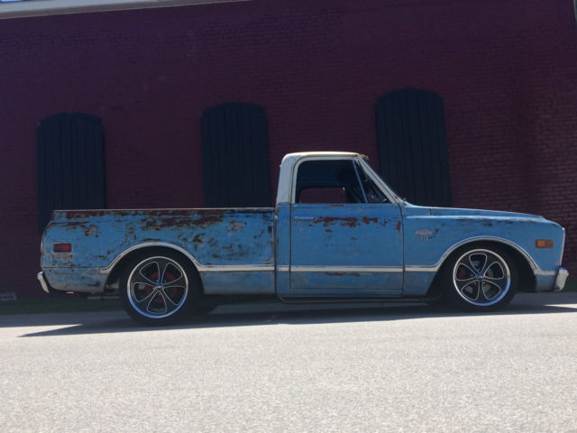 You are looking at one bad little attention getter and not for the faint of heart.It's a MAN's truck, utit hasall the right attitude. The old saying, Thelower the altitude the bigger the attitude" definitely applies. You can't go to your local grocery store without getting stopped by every dude that has every owned one of thesetruck or ever wanted one. I don't know what it is about this truck but, t just screamsAmerican. This 1968 C10 is one of a kind with 50 years worth of mother nature's love giving it the perfect paint job. This truck has earned its place in the world with all of its bumps and bruises. Up close you can see the history in the truck with each dent, cratch, nd patch of surface patina. The truck is a work of art. The trucks legend goes that it came off of a farm somewhere out in Virginia where it tended to the cotton fields and was parked under a tree for what seemed like the death of this truck. Years later a passer by out of Ohio saw the potential that this little short box truck had and took it home to start the work of bringing it back to life. I purchased it sometime after he finished most of the work and brought this Carolina Blue truck home to North Carolina. After breaking in the engine I opened up all the windows in the truck to include the lower kicker vents and took the truck up to 80 MPH. I was amazed to see the old cotton from it life on the farmflooding the floor of the truck. I couldn't believe it,for weeks it would blow out the side vents onto the floor.Theold cotton was proof of the story that was given to me by the builder in Ohio.My truck has spent99% of it lifesomewhere inVirginia. The truck when I purchased it still had the Radio Delete plate on it. I added an all Alpine Stereo system worth $2,500 which sounds great! The highs and low just resonate through you. It sound and feels better than my 2015 Dodge Ram 1500 stereo. I made sure the installers tucked everything away so you couldn't see it minus the stereo head unit. The truck has hands free capabilities to include Bluetooth. The exhaust is all new magna flow straight piped. It sounds great at idle and going through the Saginaw 4 speedtransmission that's mounted on the floor with the shifter having a nicebench seat bend. The transmission and engine have all been gone through with absolutely zero leaks. The truck sits on Riddler Rims wrapped in Goodyear tires. The cab of the truck has all new blue interior with old school aircraft lap belts. The interior has billet touches throughout.The truck has very dark tint for those hot summer days,and a nice tilt column steering wheel. Everything works and theheater blows hot. It has a chrome air tank in the rear of the truck that helps store air for the Air Ride system. The Air Ride system is a manual system with not electronic sensors to ever go out on you. the truck has disc brakes and lowering shocks with the frame boxed to allow it to go fairly low.The fuel tank is aluminum 21 gal tank that is a bed fill tank withthe old filler cap has being filled in. The bed has rough cut lumber in it that is bolted down and give the truck that patina look. The cab of the truck has zero rust with new cab mounts. The engine bay has new paint and the pictures speak for themselves. The truck drive straight and starts up every time. Very sharp truck and would look great in anyone's garage. The truck has never been featured in any magazines or taken to large car shows. I think the next owner will enjoy this truck as much as I have. Check my You Tube links below for videos of this Classic. https://www.youtube.com/watch?v=K7F9kfiAeiI Lowering https://www.youtube.com/watch?v=b20tKs0h7tE Start up and engine https://www.youtube.com/watch?v=KBCqB-9D_N4 Going through the 4 Speed https://www.youtube.com/watch?v=qGIIv1xhMPoDrive by On Sep-14-15 at 20:25:44 PDT, eller added the following information:The truck has about 5,000 miles on the build tires are at 97% tread wear. U Joints have all been changed to include billet drive shaft main bearing. The Alpine stereo was installed last month. It has two pre- amped subs under the seat. 6x9 behind the driver seat with custom enclosures and smaller mids up under the dash with custom enclosures as well. On Sep-16-15 at 05:21:37 PDT, eller added the following information:Air Ride - Lowered w/Drop Spindles18 x 8.5" Wheels in Front / 20 x 10" Wheels in Rear On Sep-16-15 at 16:42:19 PDT, eller added the following information:http a://youtu.be/FWeW2Av11so more of the truck On Sep-16-15 at 16:45:53 PDT, eller added the following information: