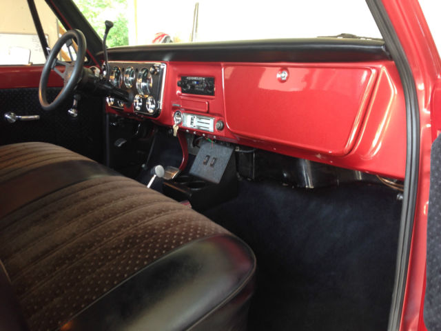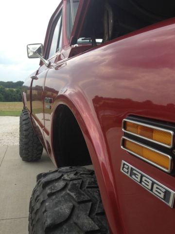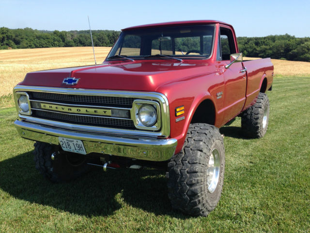Beautiful fully restored (frame off aprox 5 years ago) 1970 3/4 ton 4x4 Chevy pickup. This truck was done right. I bought it out of California, hich is where it was it's entire life, ntil two years ago (so no rust). Has a good running big block 396. 4 inch Rancho suspension lift and 3 inch body lift. 38" super swampers. Rare and heavy duty HO52 one ton rear end. Beautiful and nicely done black interior. Beautiful paint with lots of shine. The chrome is in perfect condition and shines like a mirror. You can run the full exhaust the length of the truck or use the electric cutouts to drop out the side pipes for a nice loopy rumble. Very solid wooden bed. I'm only selling because I want something I can get my kids in. You can't build this truck for this price. The last owner claimed to have over 30k invested. It has a few minor paint chips on one rocker panel (see pics). Buyer is responsible for shipping. It is also for sale locally so I reserve the right to end the auction.