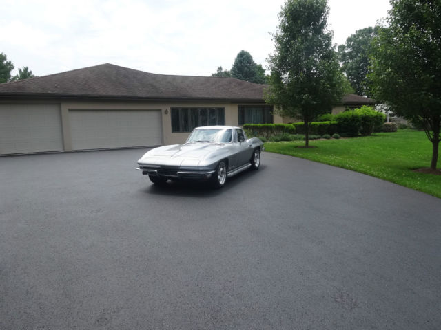 This is a 1965 corvette coupe restomod that was completed in 2008. I purchased this car in 2005 as a straight unmolested rust free car that was missing its original drivetrain. After much research, purchased an aftermarket frame from Street Shop Inc . Although there are several good frame packages on the market, chose this one because they narrow the rear to allow the use of vintage negative offset wheels which makes the car look more stock. The frame uses C4 Corvette suspension pieces and a Dana 44 rear. Coil-over shocks are used all around. A Tremec 600 5 speed and an all aluminum 427ci gen 1 small block power the car. The engine was professionally built using a Motown lite block, FR aluminum heads, troker forged crank and rods and comp cams hydraulic roller camshaft. F.A.S.T self learning fuel injection fuels the engine The engine dynoed out at over 550 hp. The body was completely stripped and painted 1963 corvette sebring silver urethane base coat/clear coat. All of the chrome was replated and looks excellent. Classic Auto Air aftermarket air conditioning was added and blows extremely cold. Power rack and pinion steering and power brakes make the car a dream to drive. The interior has a set of late model Z06 seats with power adjustable drivers side. The gauge cluster was completely redone by D & M Restoration. interior was dynamatted before reassembly. An aftermarket tilt steering column and teak wheel are also present. There is a custom autosound radio with ipod hookup in the dash. I am a long time car collector/hobbiest and take great pleasure in the restoration of my cars. Father time is creeping up on me and I am now thinning out my collection which is the reason for selling this car after ten years of ownership. I have tried to be as accurate as possible in the description but I strongly suggest that you come and see the car before considering a purchase. My price is far below build cost without labor and this car is nicer than most similar cars asking far more. Please contact me with any questions you may have. Car is located in Harrisbur, a