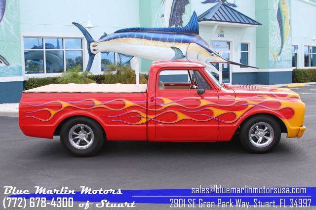 | This 1972 Chevrolet C-10 is ready to cruise down the road or take to the car show. This truck has been completely modified to be one of the nicest trucks you will see at your local car show. The truck has a complete custom paint job that spills over to the engine compartment and throughout the interior. The bed has been carpeted to match as well with a soft bed cover on a hinge that adds a great custom look. The battery has been relocated to the rear as well to keep the clean look under the hood. There is not one place you can look on this truck and not find a new detail. The motor is a crate 350 c.i. 350HP Chevy married to a 4 speed M21 Muncy manual transmission that not only sounds great but gives you plenty of power without sacrificing reliability. It sits on chrome mag wheels with knockoff spinners. Call today to schedule a viewing and test drive at our sunny south Florida showroom! -Team Blue marlin (772)678-4300 |