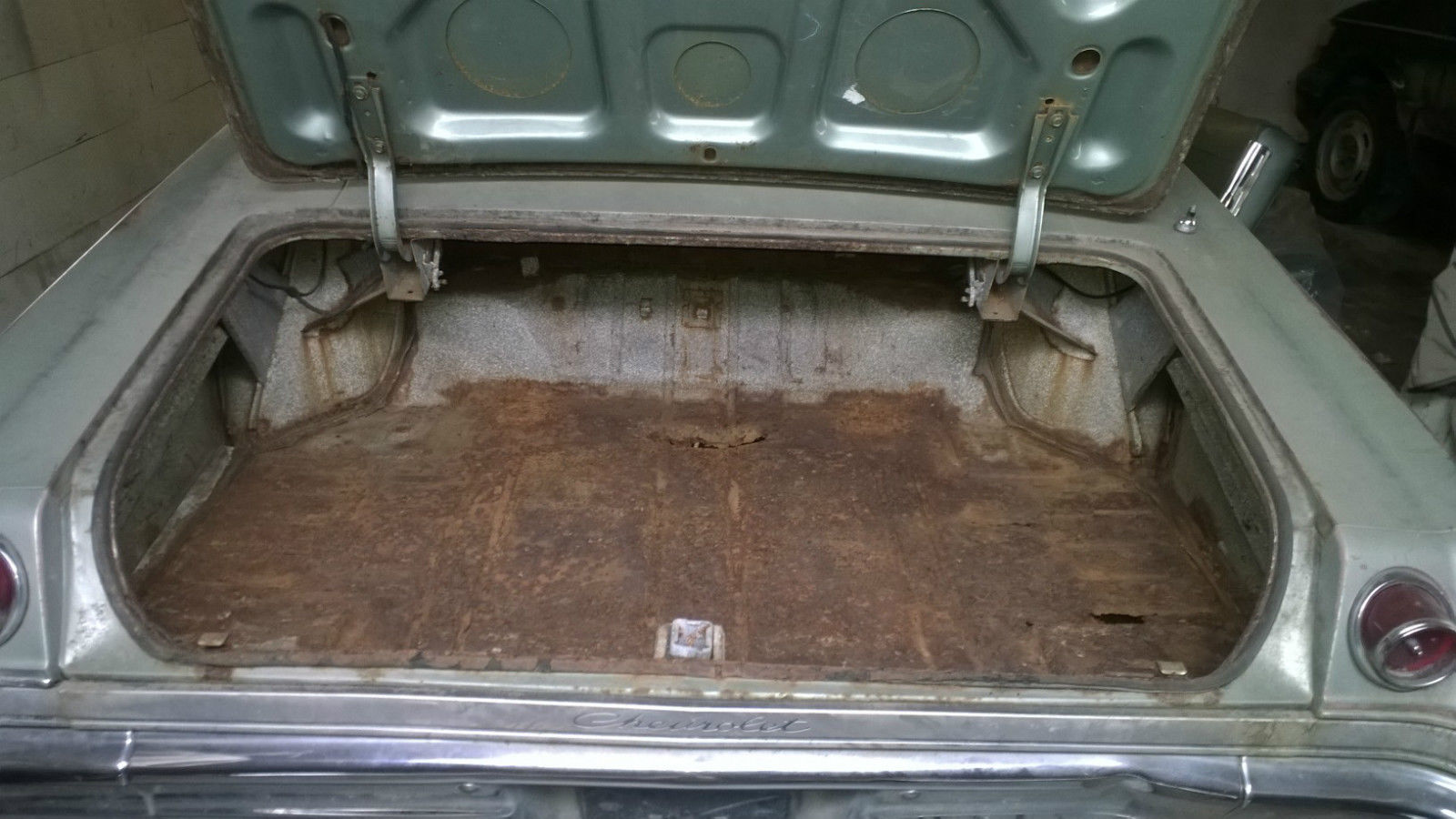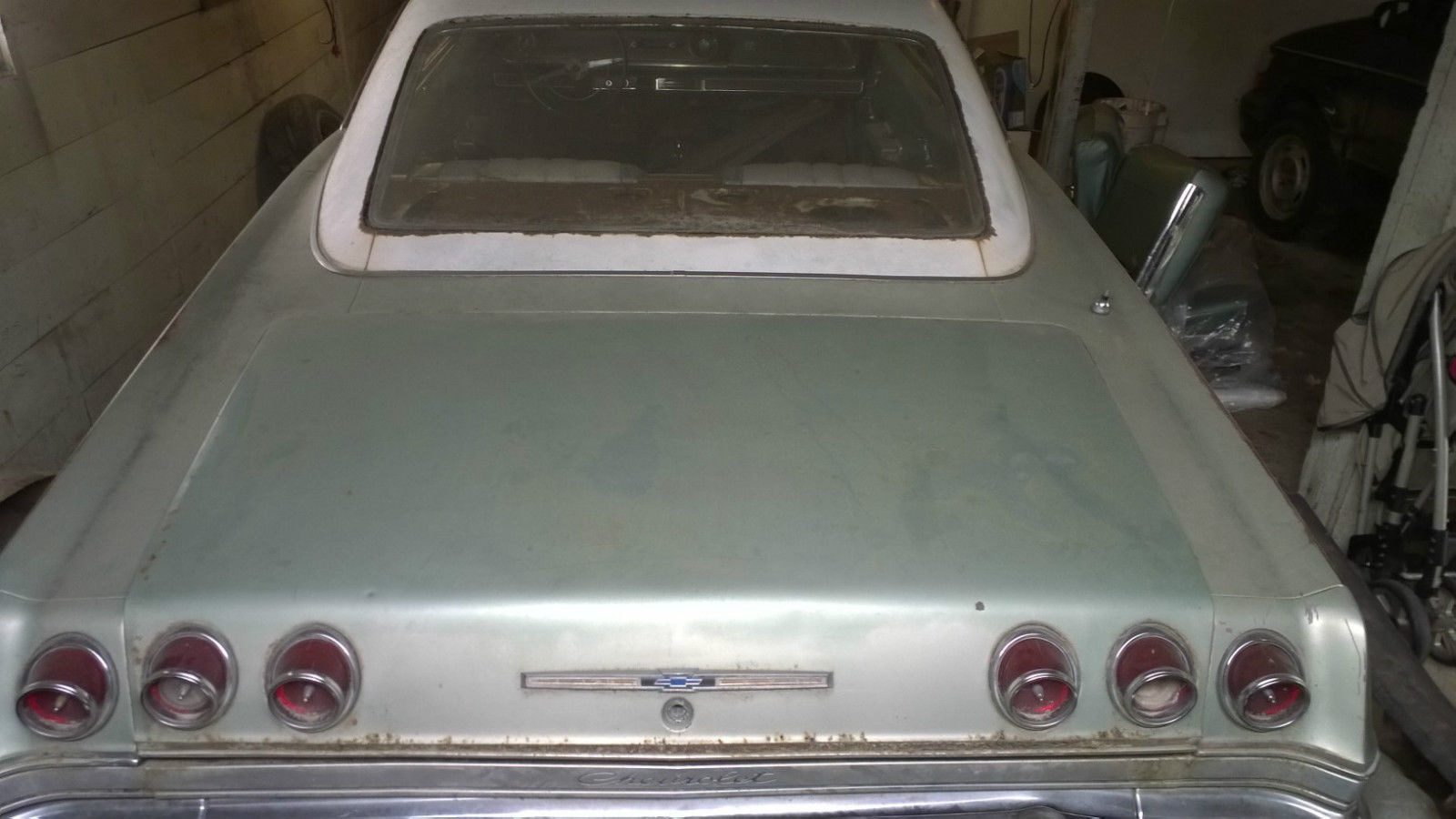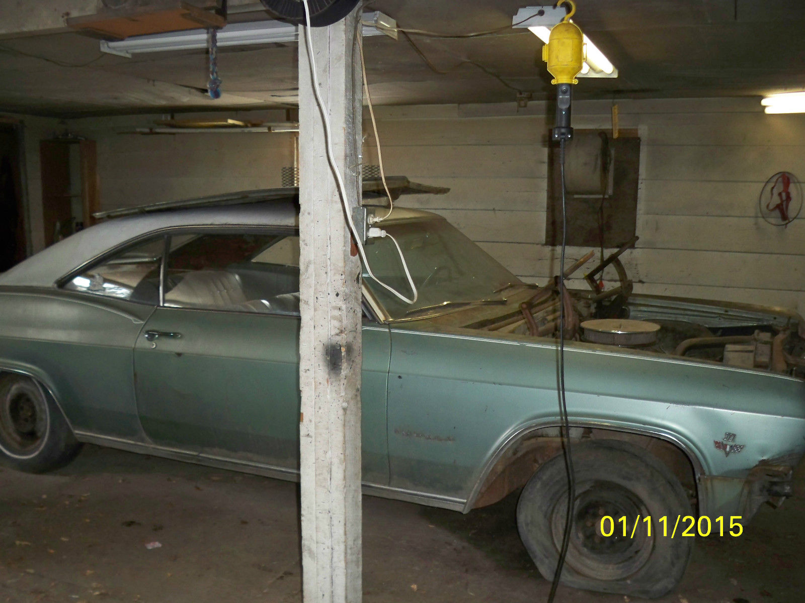 | 1965 Chevrolet Impala Coupe. It is all numbers matching 327. auto tranny. The car has sat for atleast 25 years. thats why it has less than 80. 00 miles!. The car was backed into 6 years ago. All damage was at the front of the car and did NOT bend the frame. only supports. The grille. eadlight parts and nose were damaged. i have an extra nose piece and grille for replacements. but the grille is not up to my liking as it is bent a little too. the driver side fender is rusted through at the bottom closest to the door. nd was dented in the accident. The rust is minimal elsewhere. the trunk pan is the only part rusted through. The rear window seal at the bottom and the inside rear deck lid have a good amount of rust present. floor pans. inner fender wells. and all body work have surface rust at most. Motor fires everytime if you dump gas in the carb. and will continue running as long as you feed it. The motor has had work done according to the last owner. and it does sound like it has a cam. Old school long tube headers. dont know the brand as there is no product stamps i can see. It does run beautifully and i can guarantee the motor is not locked. The trans has a hurst shifter on the floor instead of the column shift. I do not know the condition of the trans. All lights worked when we hooked up power even the dash clock ticks away still. the interior could use the typical resto. but all trim is there and the dash and seat frames are nice and rebuildable. This is one of the cleanest impala's i have come across in quite sometime. it will be an easy and cheap resto. I welcome questions and would love to answer them. Thank you for looking. All parts but misc. headlight components and carpet are being sold with the car. The car will be mostly put back togeather and ready to ship by the time the buyer takes custody. The car was in the process of being restored but only got to the assessment phase and new parts were being sourced before my brother lost his job and can no longer restore it. His loss your gain. |