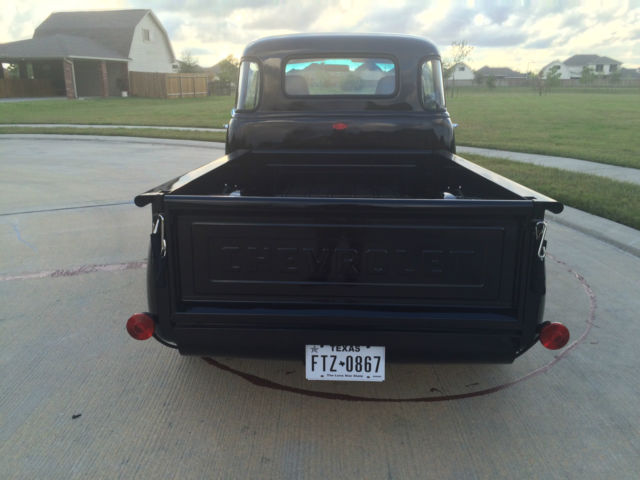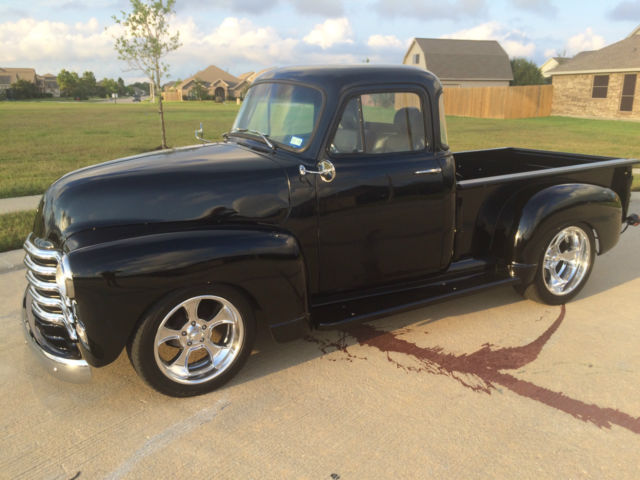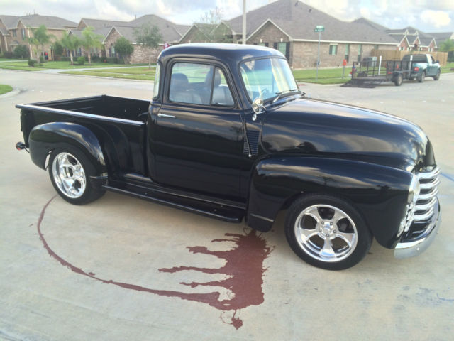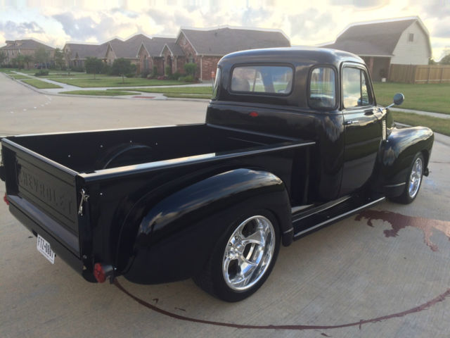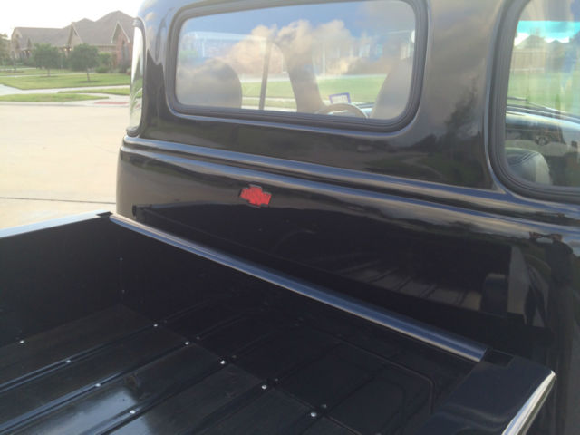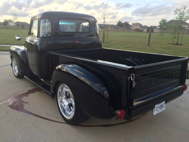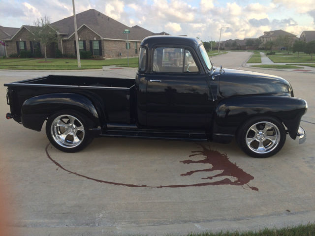 1954 Chevy LS2 Five Window You’ve heard it before, his isn’t your grandfather’s hay hauler, ut you bet your bottom dollar he wished it was! This has more options than most new 2016 Chevy trucks. The truck comes with power windows, ower brakes, ilt wheel, ower steering, utomatic trans, ower seats, eated seats, ucket seats, eather seats, C, eat, lue tooth, nd cruise control. Yes, ruise control. All this while backed by a wicked 6.0 liter LS 2 Chevy power plant putting out well over 400 horse power! You get the best of both worlds – exterior remains stock looking – low and sleek, nd the interior is as modern as you can get in a vintage truck while having as much power as you will ever need and the reliability of a modern engine. It’s a daily driver that will bring home the car show trophies. The truck is built on a 1992 S-10 frame. This truck has been completed with extreme care and everything has been done right, bsolutely no short cuts. I honestly built this to keep and drive myself so I have put a lot of thought in how I built this, hat kind of components I used and great attention to detail for all. This truck drives down the road true, traight and rides extremely well. The entire truck has been gone through, very nut and bolt. The LS2 has been wired with a Painless wiring system along with another separate harness for all other accessories. Starts and runs smooth, nd is ready to make the drive anywhere you want to take it. The 3 core aluminum radiator keeps it running cool even when you have the AC on keeping you cool. I placed the battery under the wood bed of the truck and made a hinged hide-a-way trap door for easy access. 3rd brake light is the Chevy symbol in the rear of the cab. I will be sending the truck out for wet sand and buffing this week. You will get all receipts for all purchases made for all warranties as the truck was built over the course of the last 11 months. There are far more goodies on the truck than I can explain, o contact me for any questions you may have. Tire kickers can email, erious buyers can call me at 281-900-5157. I have a clear Texas title that is in my name. The truck is currently registered and insured and has passed all Texas state inspections. Below is a list of parts that have been replaced during the restoration: Interior New 14” Banjo steering wheel half wrap black leather, ew cruise control switch, ew brake light switch, ew neutral safety switch, ew Painless wiring harness, ew power window kit, mergency brake handle, ew Dorman power window switches, ew Billet specialties column levers, ew seat belts, ew black high loop carpet, 007 Honda Accord black leather power heated bucket seats, onsole from a 2005 Neon, ront seat heater switches, ll new Omega gauges, ew Apache Retrosound radio, ew 6 X 9 Clarion speakers with new speaker box, ew headliner, ew custom door panels covered in grey leather, ew chrome door handles – inside and out, ew Vintage Air AC & heater system, ew glove box new rear view mirror, ew interior light. Exterior Fresh new black paint, base & 3 clear coats New Chrome grill, ew 7 PC front end link set – all joints included, ll new window glass – clear, ew u joints & steering shaft, ll new Chevrolet deluxe window channel & felt kit, ll new fender welt, ew windshield seal, ew AMD front Chrome bumper, ew outside chrome mirror kit, ll new black stained bed wood, ew Chrome fuel door, ew American racing Gasser 474 custom ordered and made aluminum wheels, ear - 20x10 3.5 BS Front - 18x8 3.5 BS, ll new Continental Tires, lignment on the front end has been performed. Engine & Drive Train LS2 2005 GTO 6.0L New water pump, ew LSx swap motor mounts, ew Performance in tank 58 PSI fuel pump, CM, ew AC Delco TAC module, ew Fuel pump relay, ew Oval tip 2.5 Euro chrome high flow mufflers, ll new 2.5 exhaust, ew LS2 Full flow fuel regulator/filter, ew MAF assembly, orvette gas pedal, ew battery, ew LS2 truck swap manifold headers, ew fuel line, ew AC adapter – Coldhose, ew aluminum radiator hoses, ew output seal – tranny, ew AN fuel fittings, ew 6.0L cold air intake, ew temp sensor, new 10” radiator fans, ew 3 core aluminum radiator with trans cooler, ll new belt tensioners, ew serpentine belt.