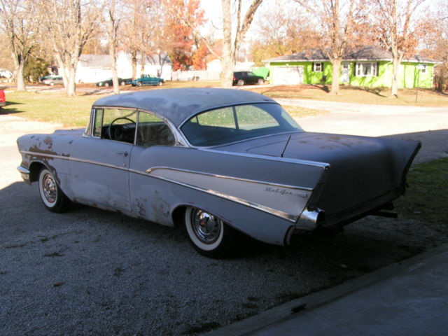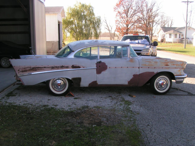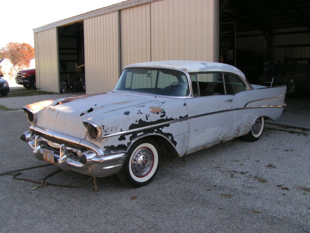 1957 Chevrolet Belair hardtop 283/270 Horse This car has been sitting since 1976 when it was last registered. I purchased it from the secondowner. When was the last time you seen a real factory 2X4 car with everything there to restore? It is a project but everything is there for the car. It still has the original EB code motor, riginal carbs are there in boxes the first owner had them restored in 1980 and never installed them so the boxes are falling apart, riginal 997 heads correct dates, rginal aluminum intake, ual point distributor with figure eight coil bracket, oth deep groove pulleys original 3/8" fuel line still has the factory batwing aircleaner with the passenger offset pod to clear the deluxe heater and in excellant condition. The only thing missing is the generator was replaced for a standard rebuilt one but the generator mounting bracket is the correct low profile one for the 2X4 cars. All the stainless is present but not on the car. BF Goodrich bias ply 7:50X14 tires wide whites. The car was originally dusk pearl with a white top. As far as rust there is a couple floor brace to inner rocker that are bad on each side and rust in trunk only where inner wheel house meets the trunk sides. I have photos included of the only rust on the body. If you appreciate the original cars over the built ones this is the car for you. Call anytime 217-620-3405