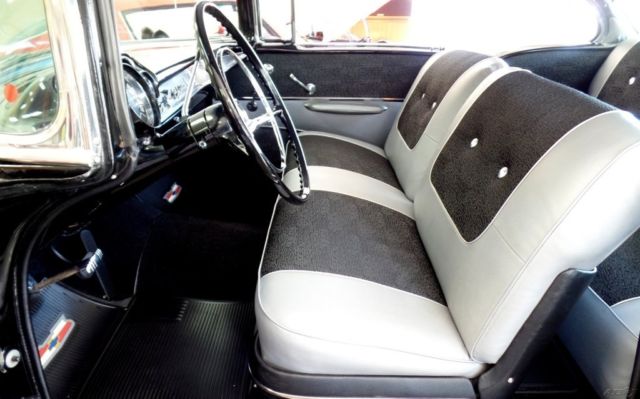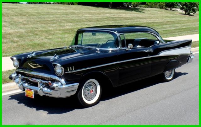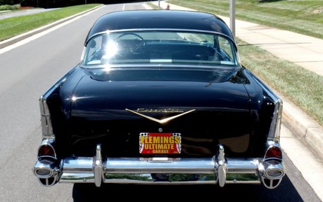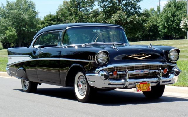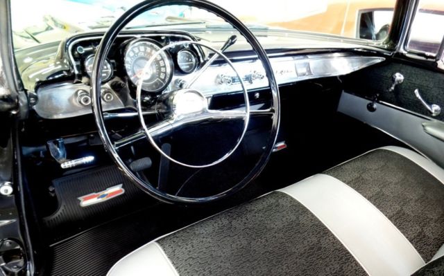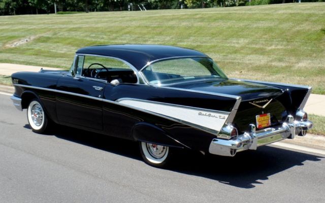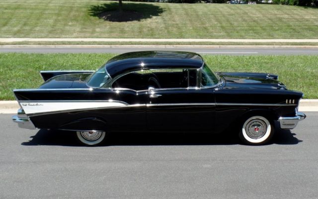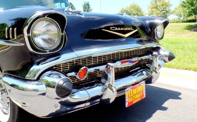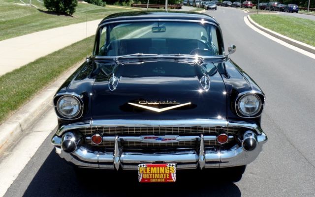 '57 Belair, riginal Chevrolet 283cid V-8 with correct Chevrolet script valve covers, orrect coded Onyx black paint w/ stainless inserts, orrect black and silver fully restored 6 passenger interior, atching removable fender skirts, orrect oil bath air cleaner, riginal style looking radio but has AM/FM/CD/Ipod hookup, rand new wide white radials w/ correct spinner hubcaps, reat sounding stainless dual exhaust, how detailed engine compartment and trunk, etailed and painted frame, ew gas tank, etailed undercarriage (look underneath this car!) timeless style no matter where you go in it, rofessionally restored to show or drive!