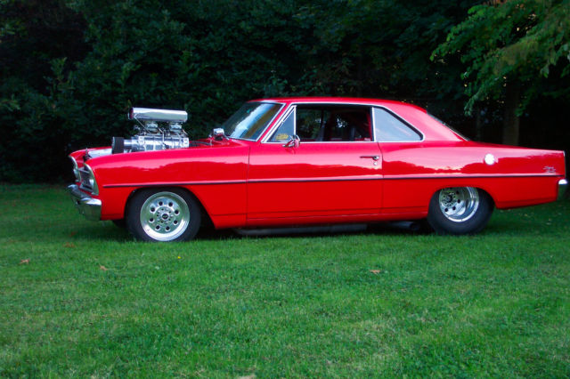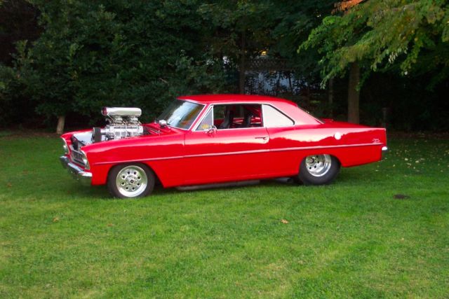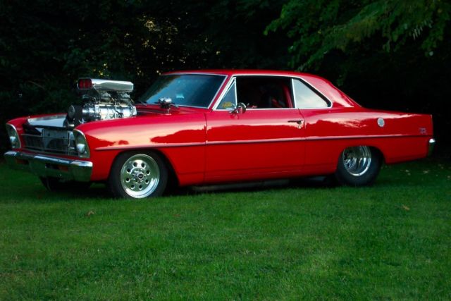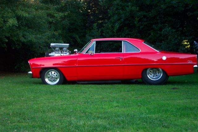 Warning If you don't like attention or don't want to feel like a rock star please move on, his is not the car for you .This car demands respect from those who look at it and the person that owns it.This bright shiny red 1966 chevy 2 super sport 138 code nova is a perfect example of what a Pro Street Chevy 2 should look like, ound like and perform like. From its clean straight body to its shinny red paint to its bad ass power plant this car is truly a treat to drive .This proven street car combo works very well from its drivability as well as being fully functional. All the lights work, ignals,headlights, igh beams, ow beams, ack up lights, es even the horn works. Iteven has tilt steering .The 4 link back half allows the car to have a nice low stance with the wheels tucked oh so nicely in the tubbed rear quarters .The motor was built by Ken Chapman from First Class. 468 cubic inch blown big block with all the bells and whistles looks and sounds and performs like a fine tuned machine should.This car has won many awards at all the big car shows in the area. Here is a chance to own the car you have been dreaming of for a fraction of the cost that it would take to build it .I live right on the Canada/USA border and can assist with shipping . Serious enquiries only. Feel free to ask questions, ut please, respect your time and in returnI ask that you respect mine. This car belongs to my brother and I am listing it for him. I will supply you with his direct contact information upon request as I know nothing about the car other than it is awesome!! Please be advised that there is a 2,000 dollar non refundable deposit required to be paid in full within 48 hours of the auction ending via paypal.
