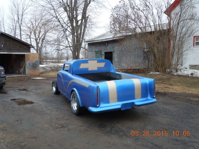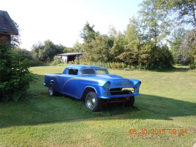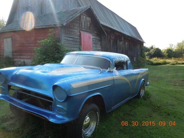 I purchased this 55 210 post car which was made into elcamino from friend who needed cash,i do not have time to finish as I have other projects going on at present time.Car was chopped,has 1 pc fiberglass tilt front end end,bucket seats that go with car,i have grille and other trim pcs,dash has had original gauges etc removed,filled with metal and holes drilled for new round gauges.Tires and rims on car do not go with it but will supply wheels for transport.Car has a Camaro front clip and late model non posi gm rear end.car being sold as i, where is with bill of sale only.Good luck and if you have any questions you can call me at 1-315-250-6732