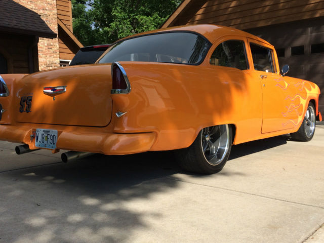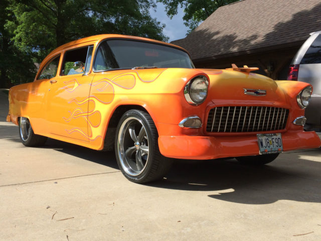 Time to say good-bye to my baby! 1955 Chevy Belair Metallic orange flamed, ir brushed, lear coated. bumpers too. 2 door post sedan power steering 383 chevy small block, ith Dart heads and Headers Runs cool, ever runs hot. car cover included Dual exhaust, ice rumble. Billet pulleys Chrome alternator braided hoses TH 350 auto trans. was leaking so had it completely overhauled July 2015. front disc brakes Lokar rear mini tubbed rear Boltless alum bumers MSD ignition 225/40R X 18 93 H Ventus front tires 90% 275/40 ZR X 18 99W, F Goodrich rear tires 90% Boss alloy two tone rims Battery cutoff switch Black interior and new carpet New adjustable seats front, ith seat belts Short Rear bench seat, tubbed rear with belts Glove box Ash tray Cig lighter New Tank Battery in alum box in trunk carpeted trunk New Radio, mp, ub, peakers, ounds great under dash gauges ceiling mount autometer tach three mirrors Heater licensed and state inspected, rive anywhere Ken, t. Louis, O area, ell 314 974 0282 will deliver to you. I have a new Dodge rollback, 1 per mile one way. trade for ??? do not call and ask to list this car for me or sell it for me. |