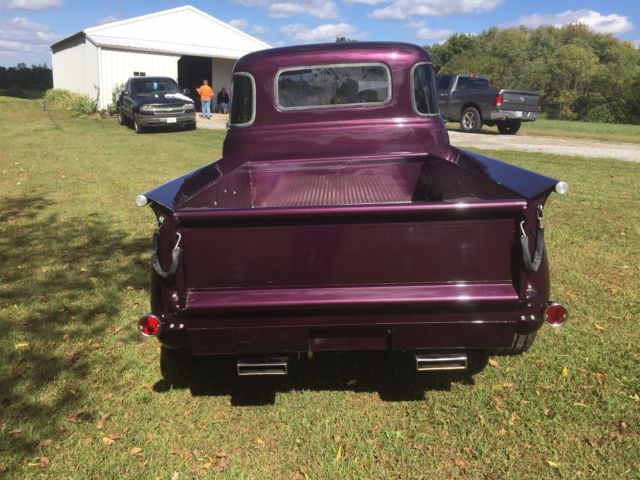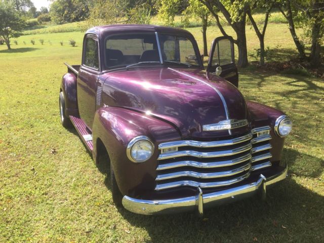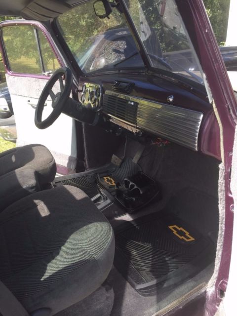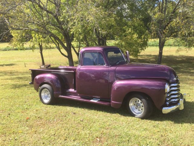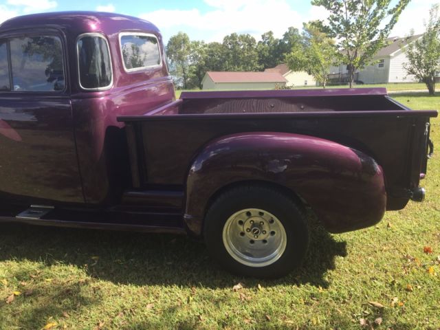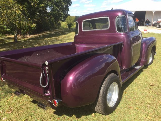 52 Chevy 3100 ½ ton short step-side bed Prowler Purple, verything is new or rebuilt. 350 SBC new KB forged pistons 11:1, ew Dart Iron Eagle steel heads, Steel crank all good parts. Aluminum BE Cool radiator, lectric fan, Newly rebuild 350 turbo with HD gear set 9" Ford with 3 link suspension and new Pro -Shocks All steel original body except reproduction steel tailgate, ith new chain/hooks New polished diamond checker plate floor in bed, uel tank under the bed with flap in bed. New chrome grill, umper, umper guards, ead lights, urn signals, all new tinted glass, rame up restore with S-10 frame. Weld Drag Light style wheels 10" on rear, " on front new BF Goodrich T/A radials all around, All cloth interio, lectric windows, lectric door locks, haved door handles Billet dash with VDO gauges, M/FM CD, |