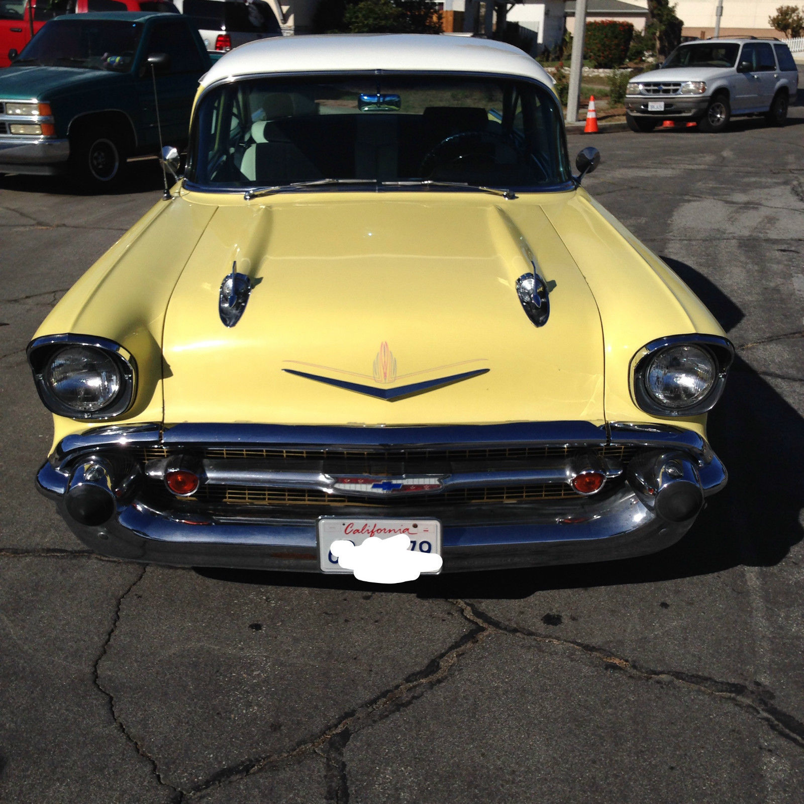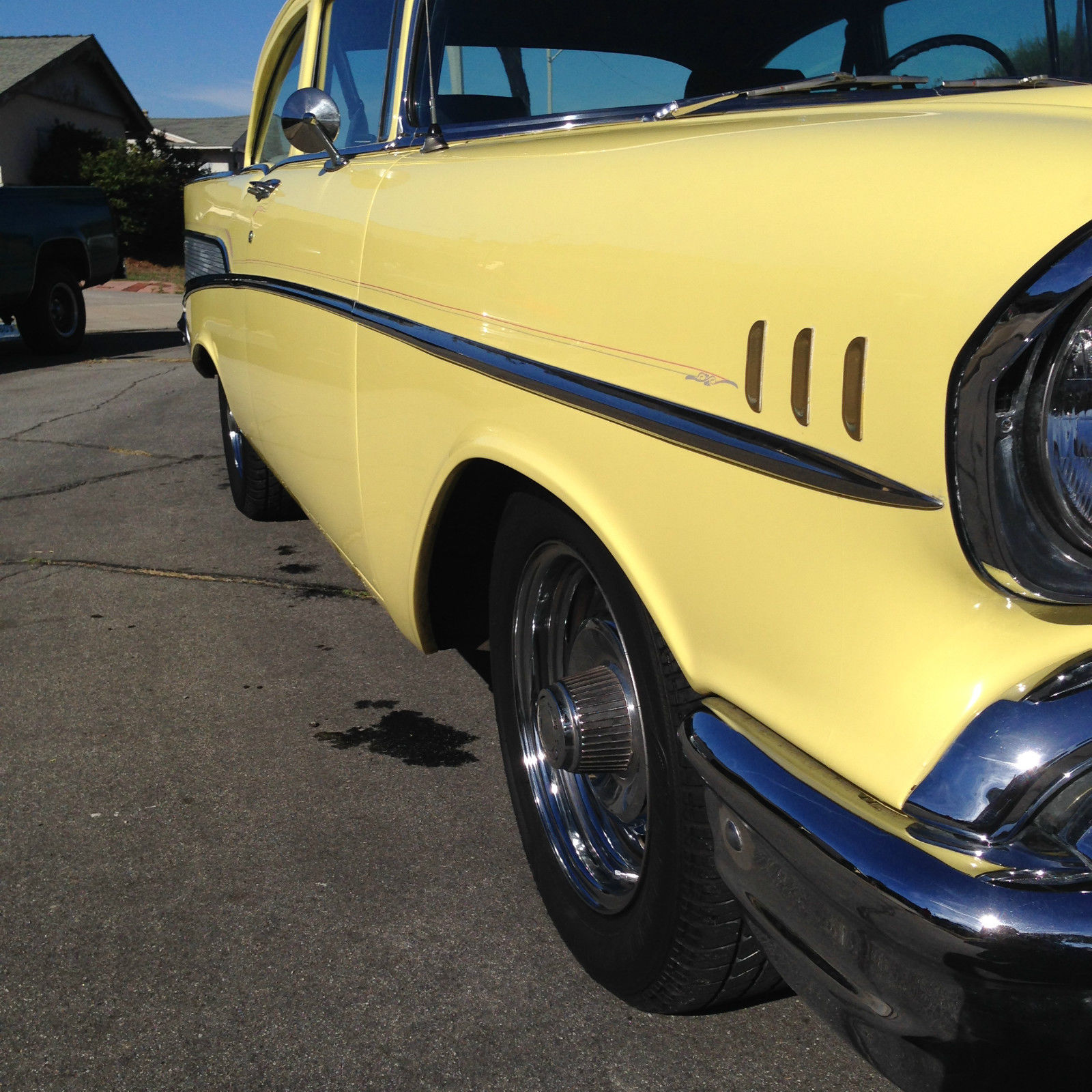 1957 Chevy 210 with Bel Air trim. was restored 6 years ago done in two tone #816 Colonial Cream/India Ivory. 350 crate motor and 350 trans has about 25k miles on them . delbrock intake manifold and carb. power brakes disc up front drum in back. power steering(new box and pump). new interior done in the original color code Ivory/Charcoal. all suspension was redone (has drop spindles up front) new radiator. runs great fun to drive . everything works (yes even the clock) let me know if you have any questions