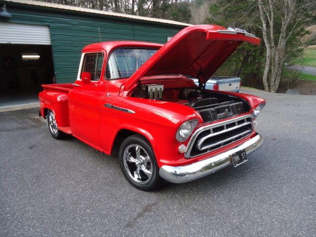 Up for sale is a 1957 Chevrolet 3100 c-10 pickup truck. This truck has a Camaro front clip and a 10 bolt Camaro-nova rearend. Under the hood is a 327 small block chevy engine with amild cam, lumunium intake, nd a eldebrock carburator .It has a B & M shifter with a350 turbotransmission, oated heaters, ower steering and front disc brakes. Thewipers work, eater works and all the gauges work. Radio works and also has a cassette player that works. The interior is in very good shape with cloth seats and the carpet is in good shape. New Ridler wheels and new tires....17's on the front and 18's on the back. Just stained the wood in the bed black and also painted the underneath of the truck black and found no rust. Paint on the truck shines like a new penny but is older paint so it does have some cracks and spider webbing in places.(shown in pictures) (these places are found on the doors and the fenders) But you have to get the truck under inside lighting to see it....can't see it outside so much. You can drive this pickup anywhere you want to go and it gets lots of attention.....Lots of thumbs up!! So if you are looking for a great little truck then don't miss out on this one.....Bid! Also for sale locally...Reserve the right to end auction